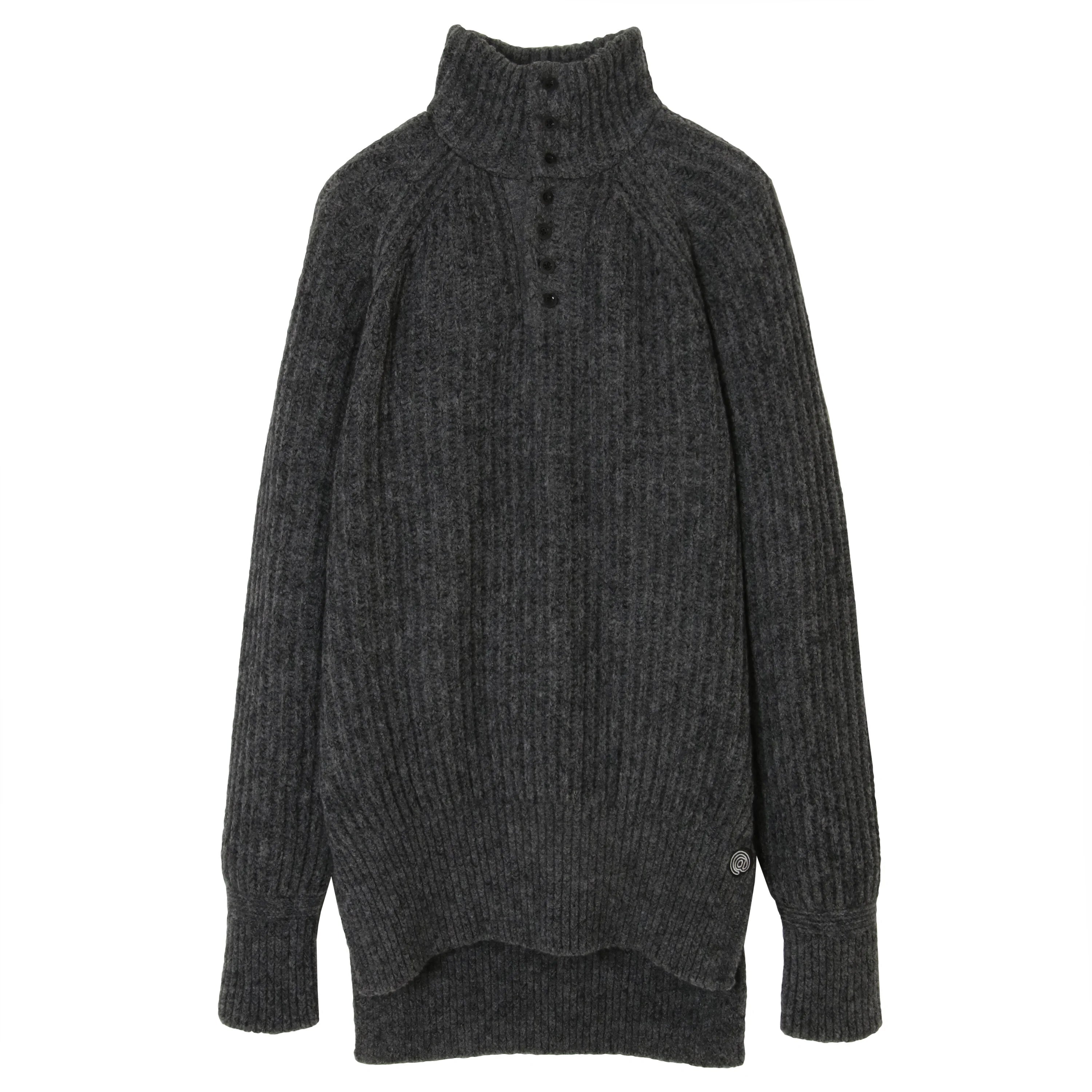 洗濯を繰り返し経年変化でシルエットが変化したニットをベースに数箇所にハサミを入れ、別のニットを何枚も当てて形を変形させてオーバーラップさせ導き出したシルエットです。 絶妙な丈とボリュームが、スタイリングの幅を出してくれるでしょう。 深めのスリットに、ラグラン線にアクセントで編み地変化を入れ、袖は長めの設定。また身幅たっぷりとりリブでしっかり締めることで丸みを帯びたシルエットになっており、襟は開けて寝かすことで違う表情になりスタイリングをお楽しみいただけます。