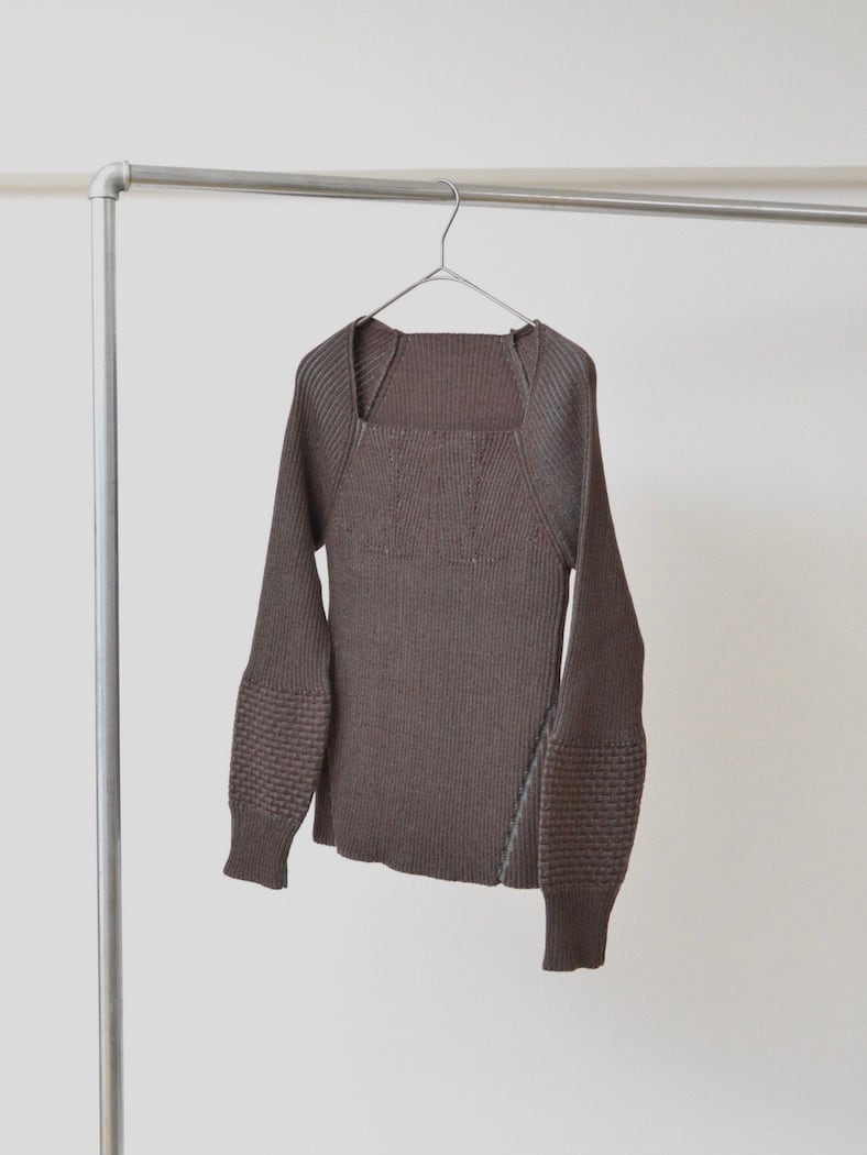 スクエアネックのラインが綺麗な、リブの変化編み が入ったデザインプルオーバー。