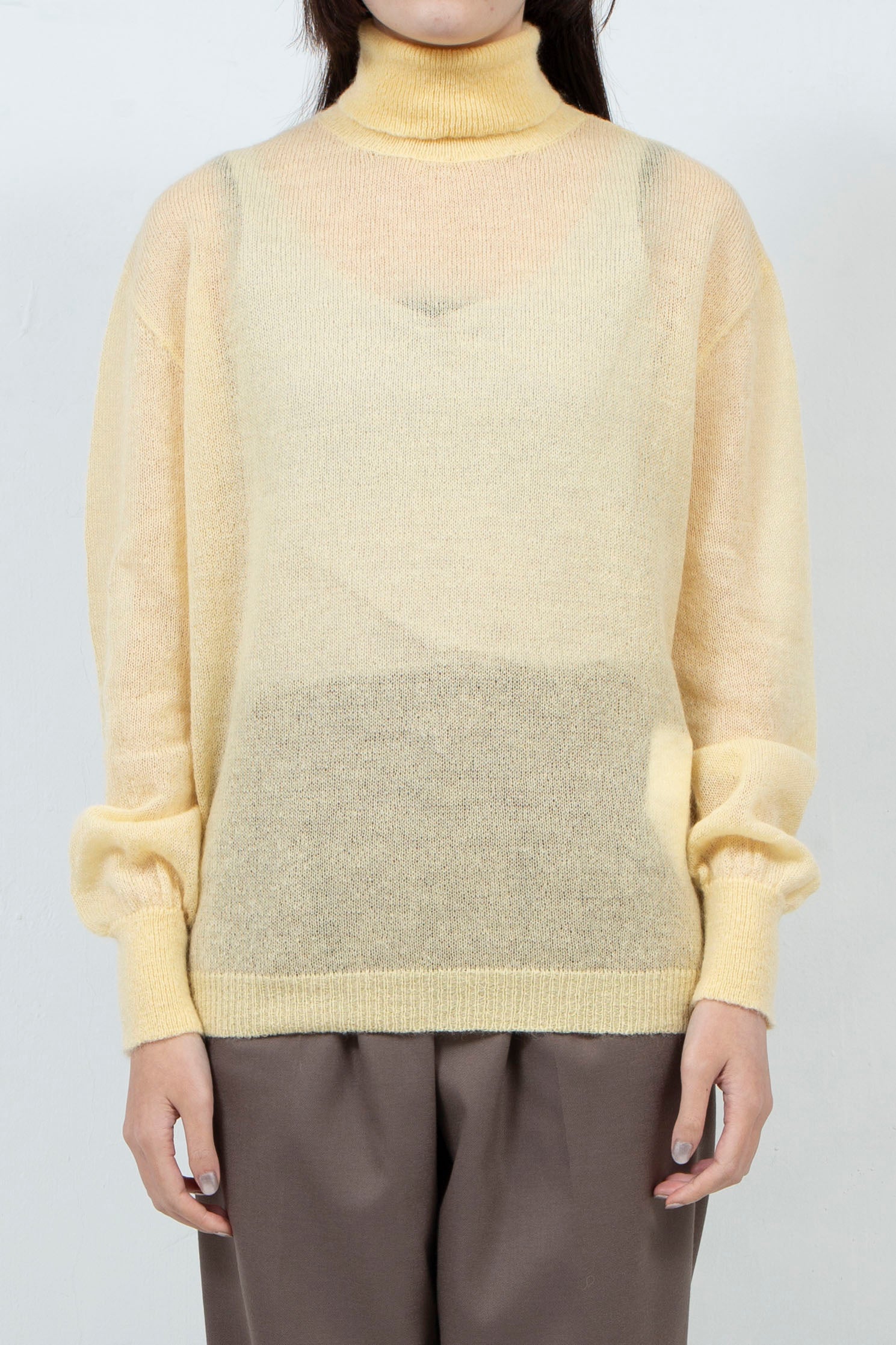 キャミソールとの重ね着や、ワンピースの上から色と透け感を足すスタイリングもおすすめです。生地は、微光沢でストレッチが効いています。