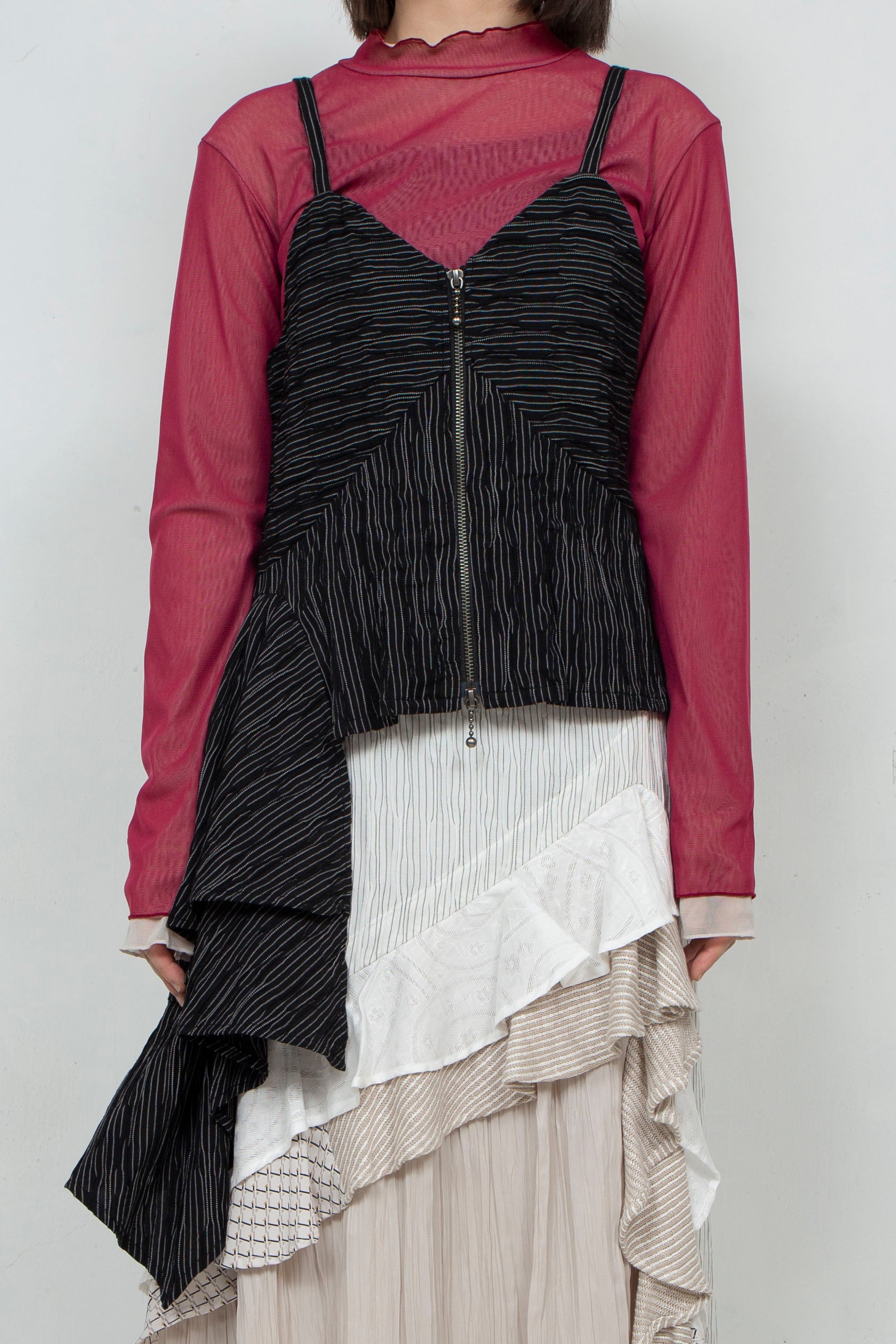 ストレッチ性のある細いストライプ生地を使用したスカート。5種類の生地をパッチワークしたフリルが特徴的。前後どちらでも可愛く着て頂けます。