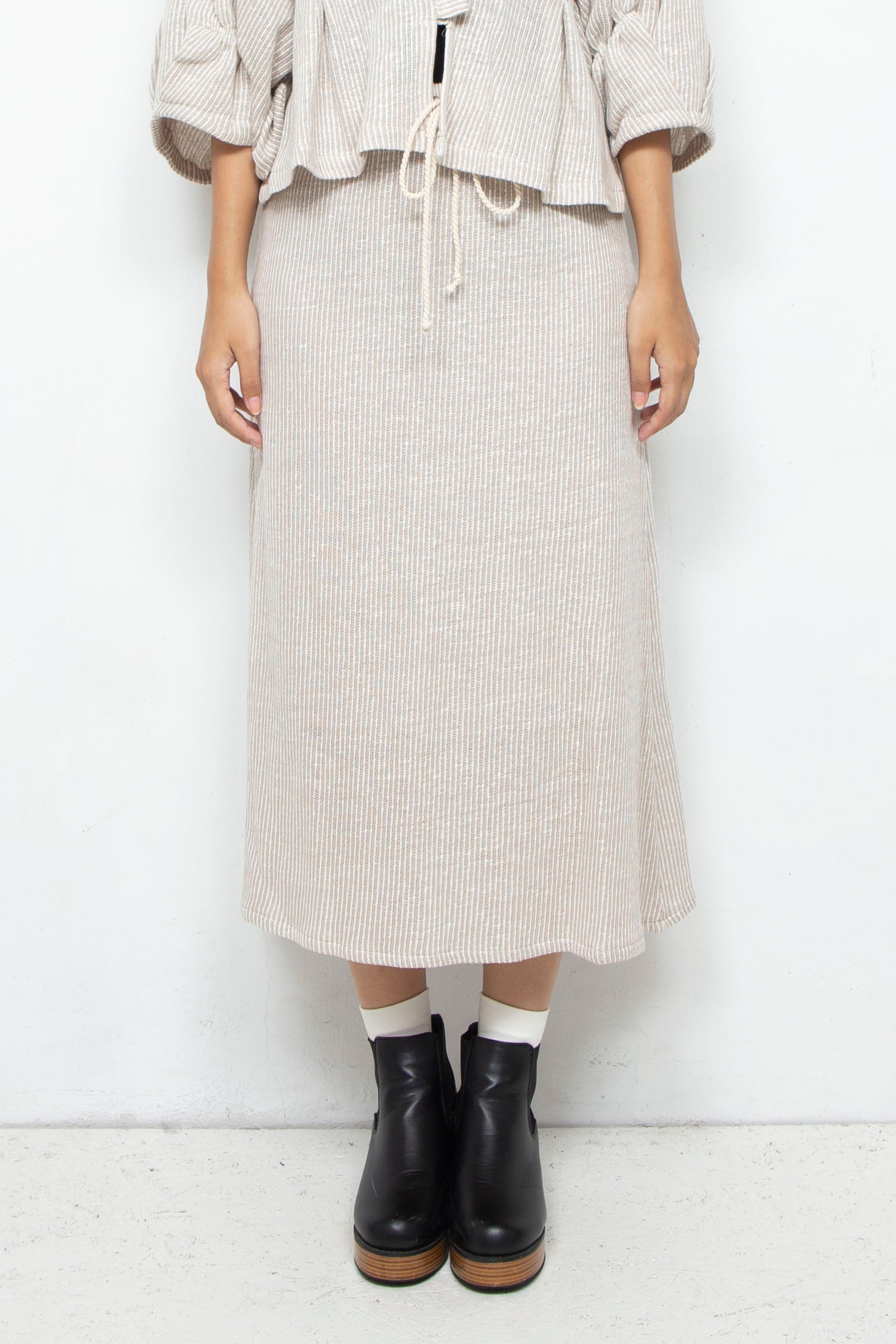 ストレッチ性のある細いストライプ生地を使用したビスチェ。片側に長くとったアシンメトリーなフリルがコーディネートのポイントに。