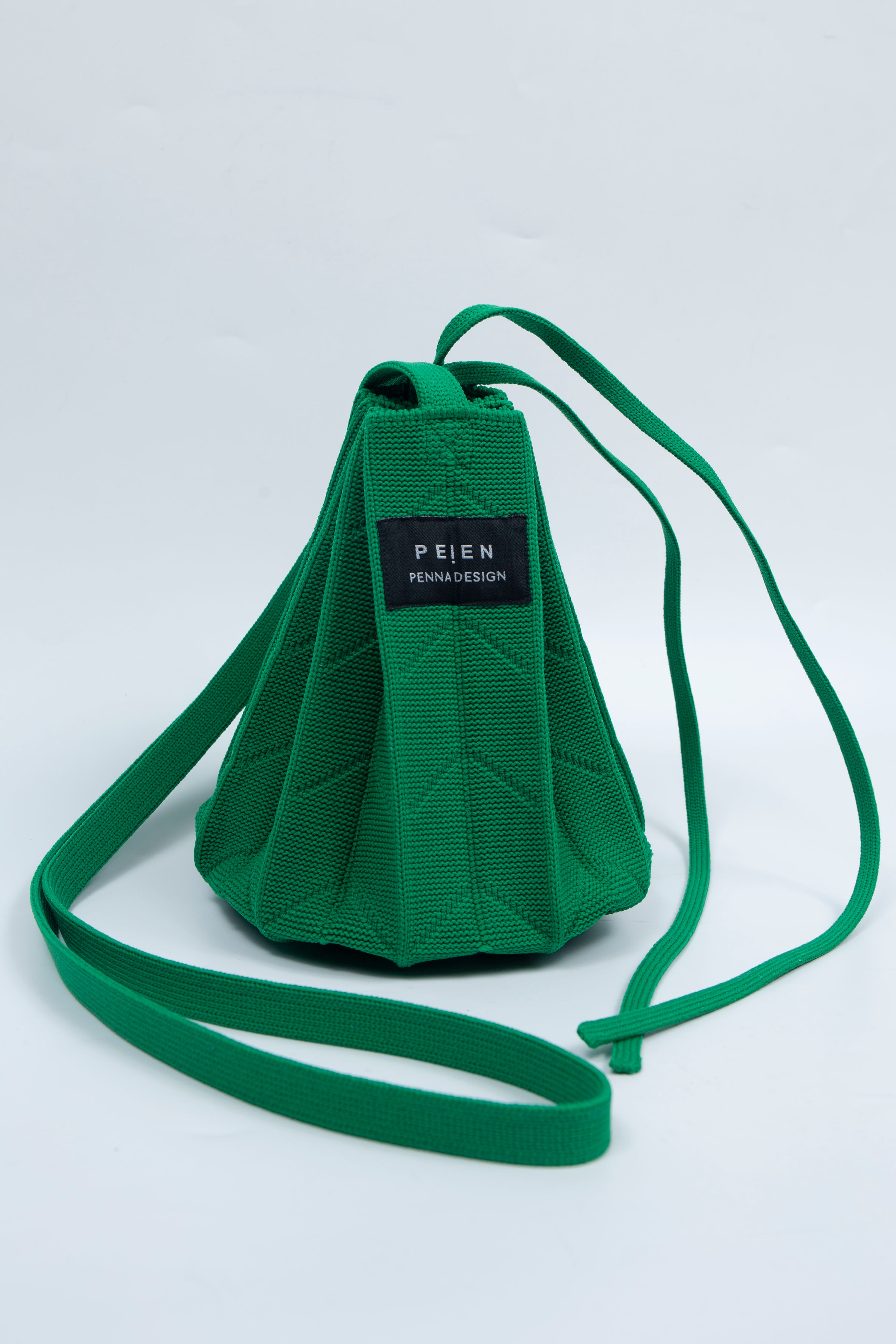 一つのアイテムで三通りのシルエットが楽しめるニットバッグ。