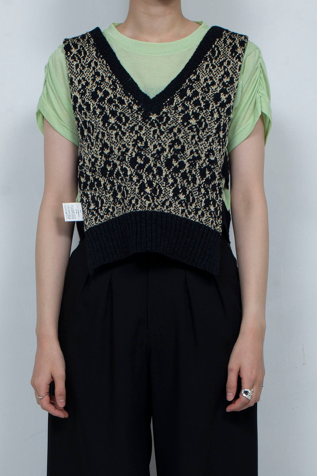 深めのVネックでレイヤードもしやすく、サイドはニットベルトで留まっているので安定感もあります。