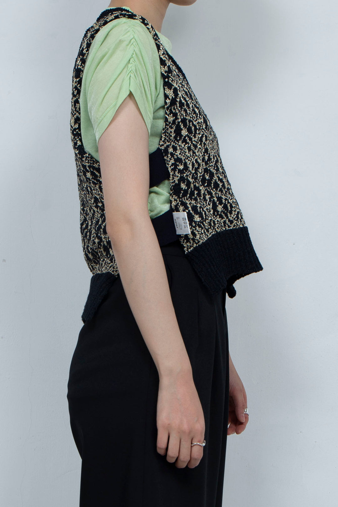 ニットはプレーティング編み(添え糸模様、2色の糸を同じ糸口から引き揃えて編むことで、表と裏にまだら模様に不均一に糸が出ます。)をしていて、表面はゴールド糸が横に流れ見える割合が多く、裏側は黒が浮き出てシックな印象に。