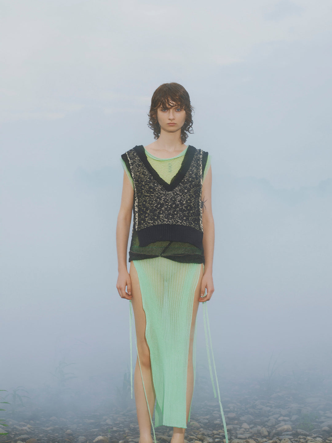 リバーシブルで着用できるニットタンクトップ&ベスト。光沢のあるベージュの糸がゴールドに輝き、リュクスな雰囲気を醸し出しています。