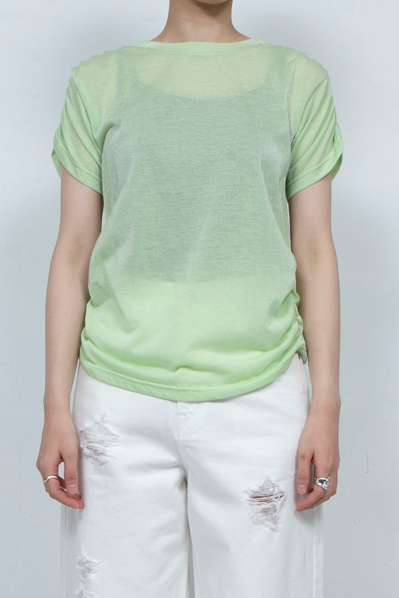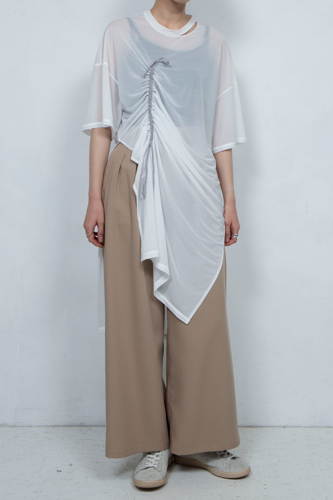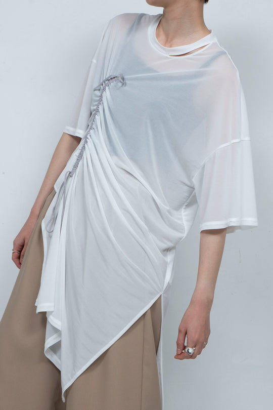 大胆に取り入れたギャザーが特徴のドレープワンピース。ギャザー部分には紐が通っており、結ぶことでアレンジが可能です。