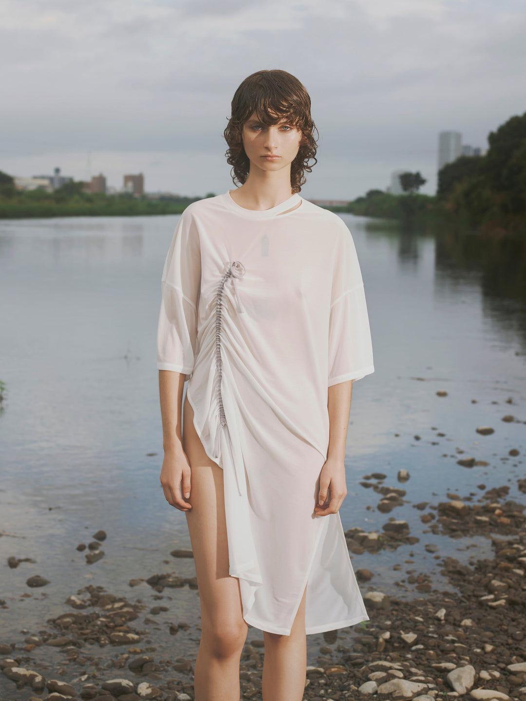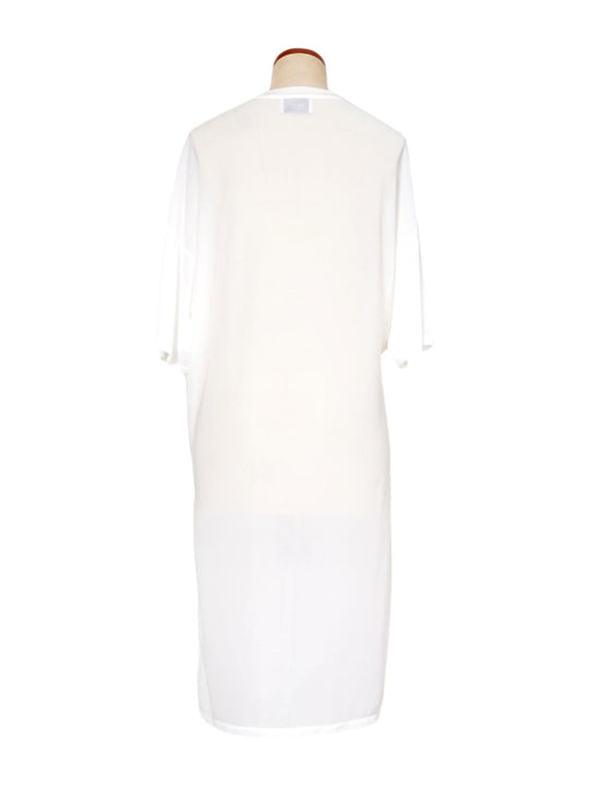 首元のスリットもアクセントで、左右の裾にも長さの異なるスリット入り。軽い素材感と美しいドレープでドレッシーに仕上がるワンピースです。