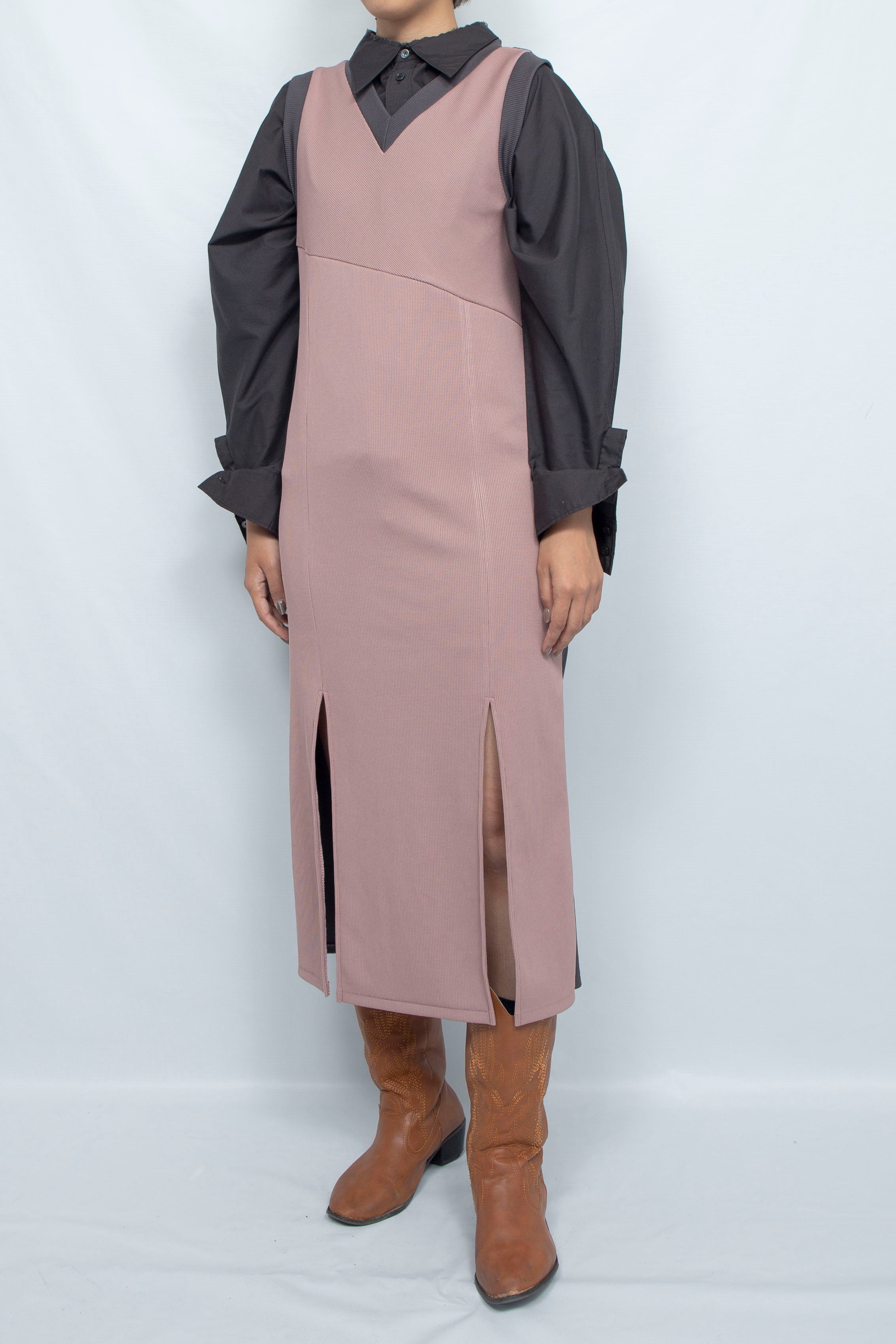 胸元がレースアップ仕様のノースリーブワンピースドレス。少し大きめな襟が特徴で、スリーブ部分は切りっぱなしに、白のステッチがアクセント。