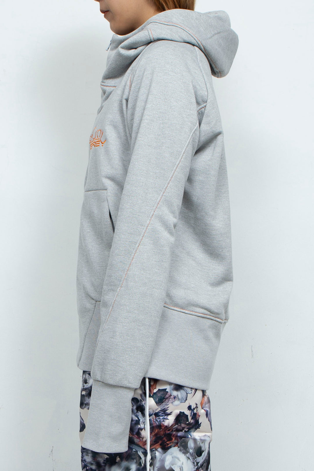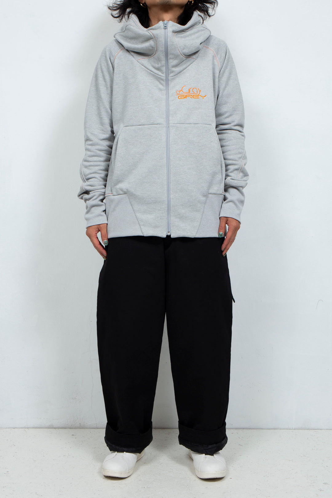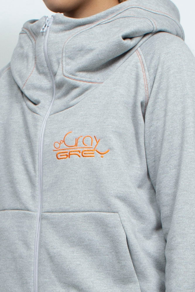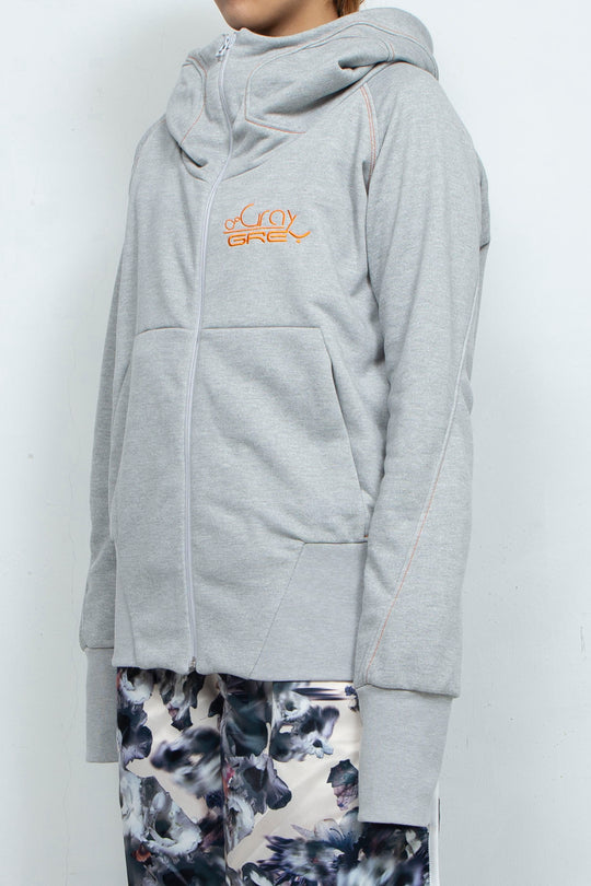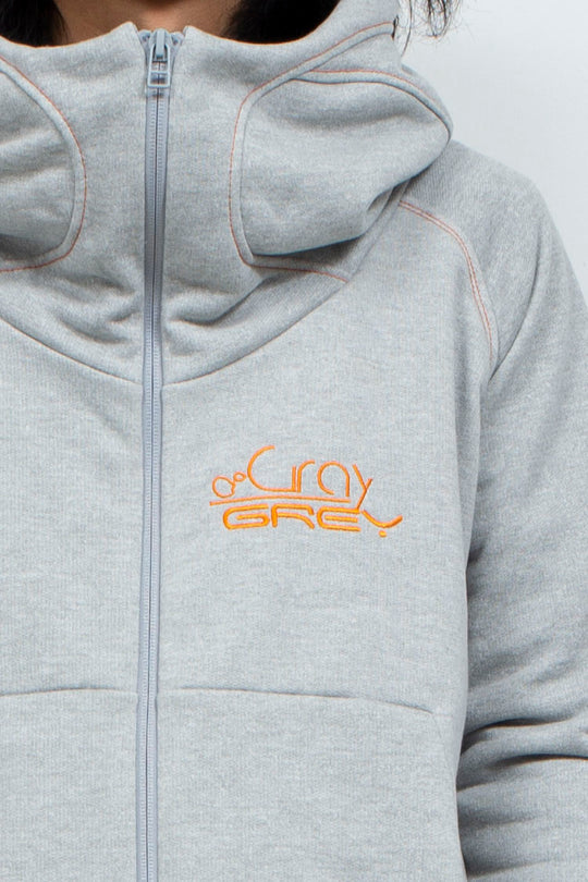胸元の刺繍は「Gray Grey」の文字デザイン。フロントファスナーはアクセントカラーのように映えるコイルファスナーが使用されている。