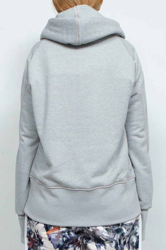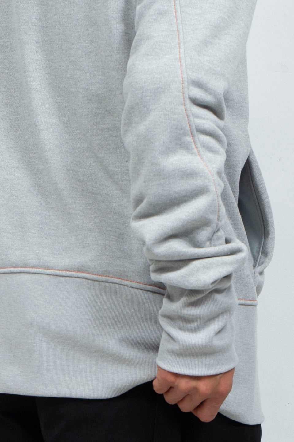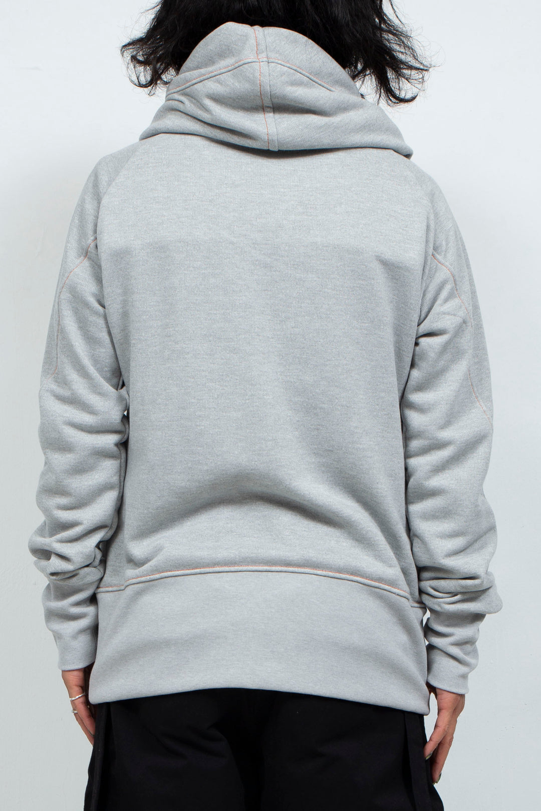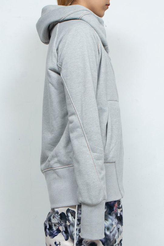 胸元の刺繍は「Gray Grey」の文字デザイン。フロントファスナーはアクセントカラーのように映えるコイルファスナーが使用されている。