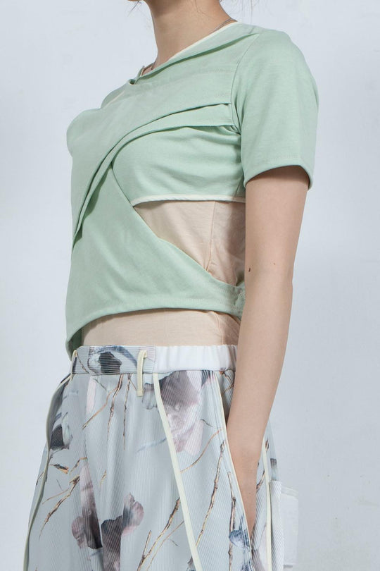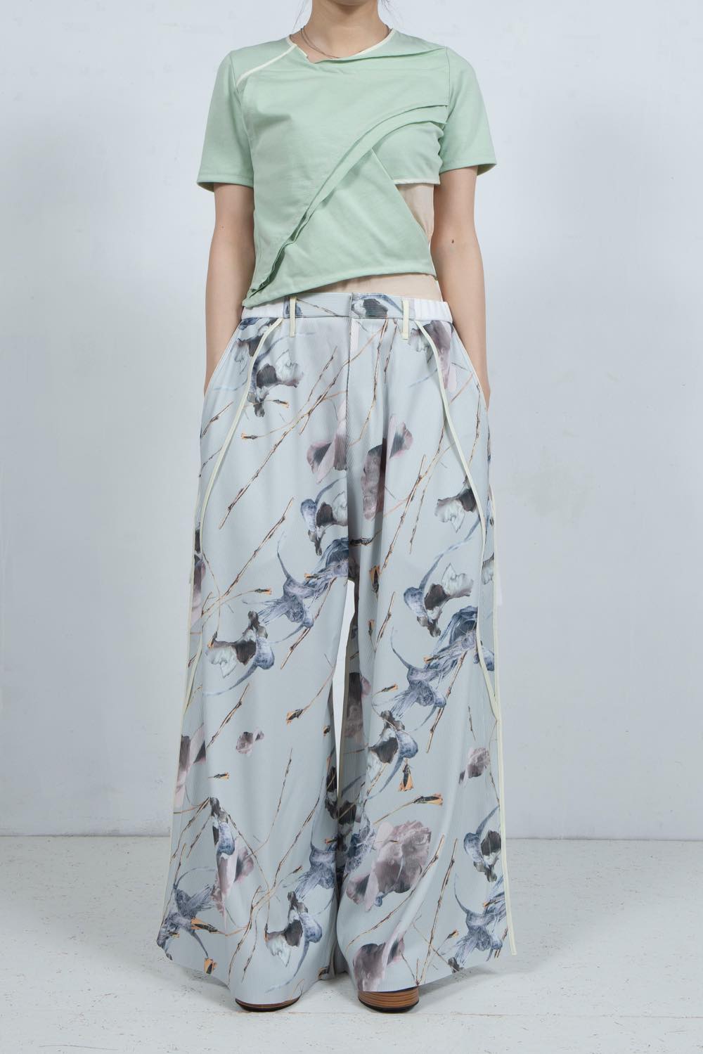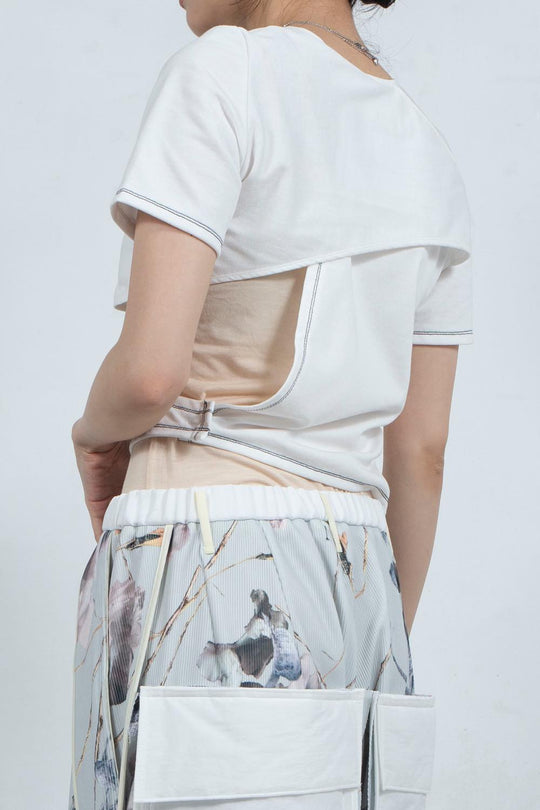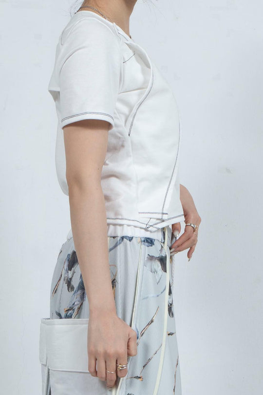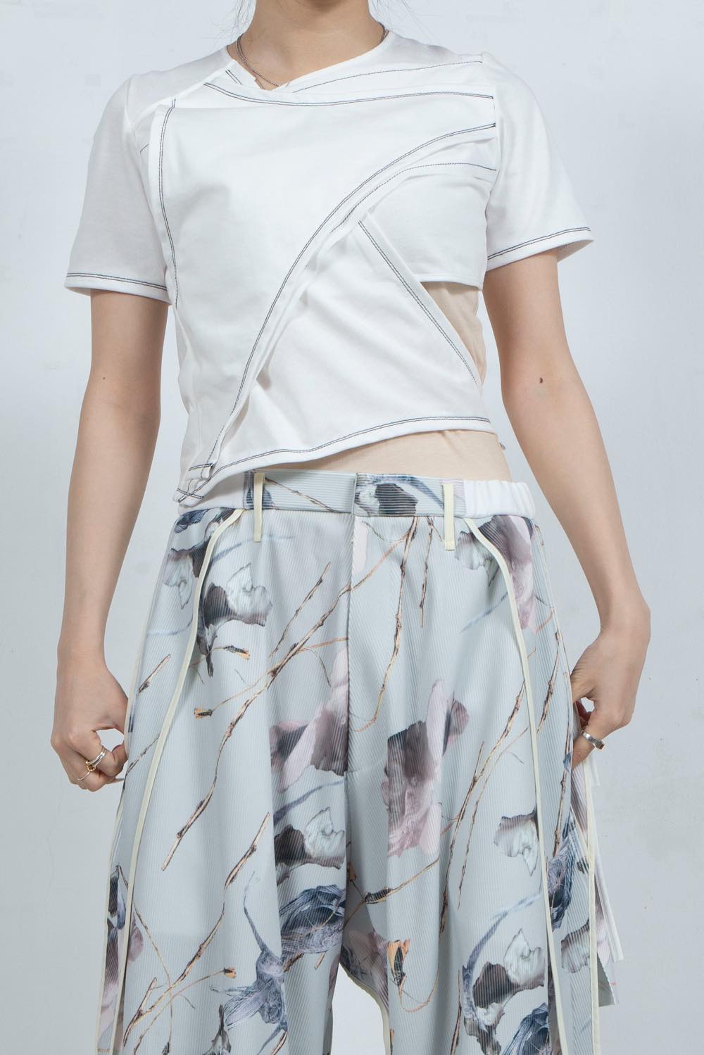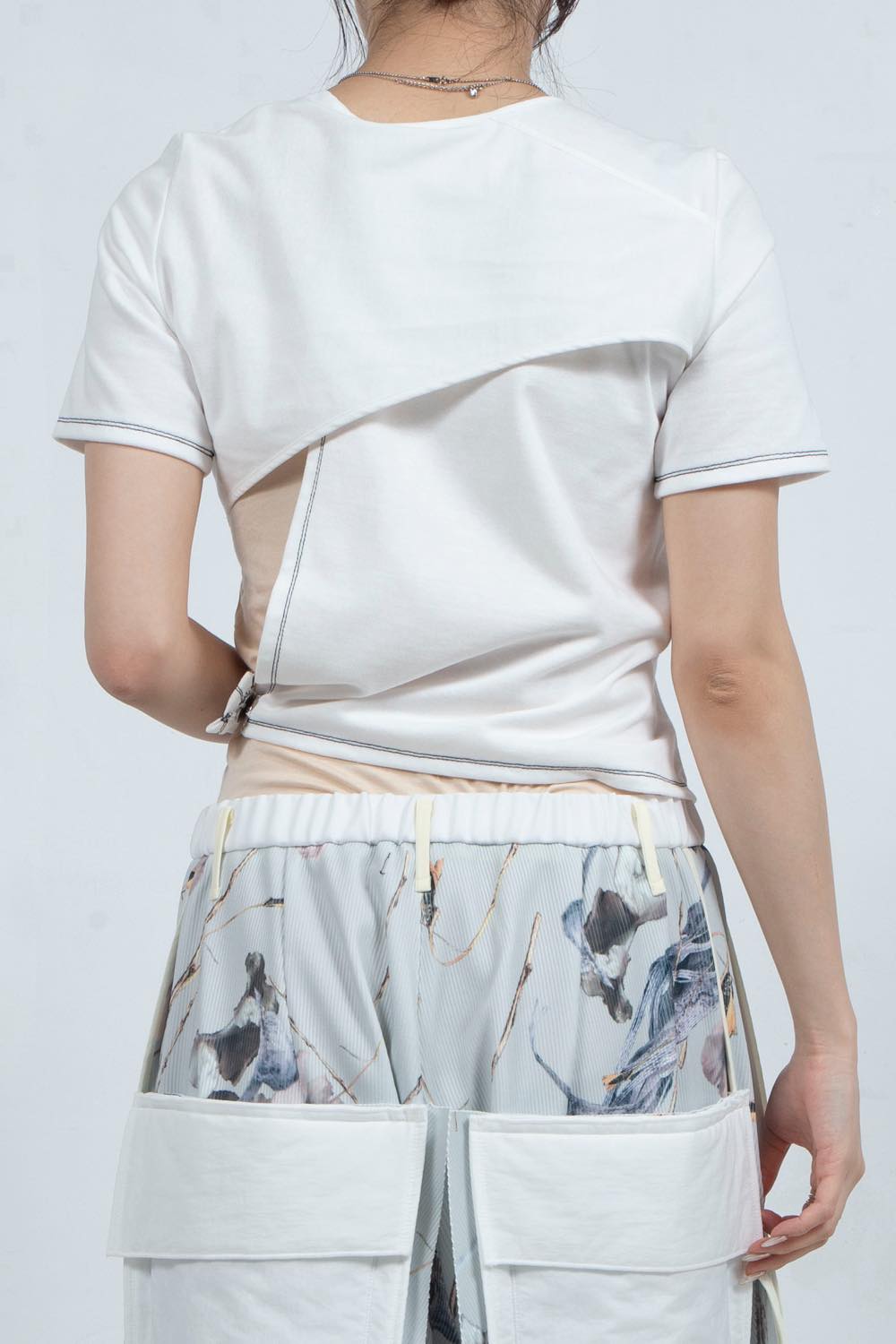 レイヤー状に重なったパーツとタイトなシルエットが特徴的なトップス。身頃の左脇にはスナップボタンのアジャスター付き。