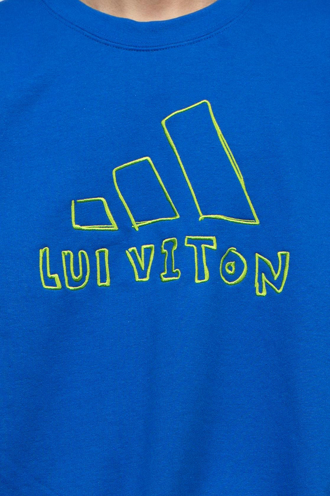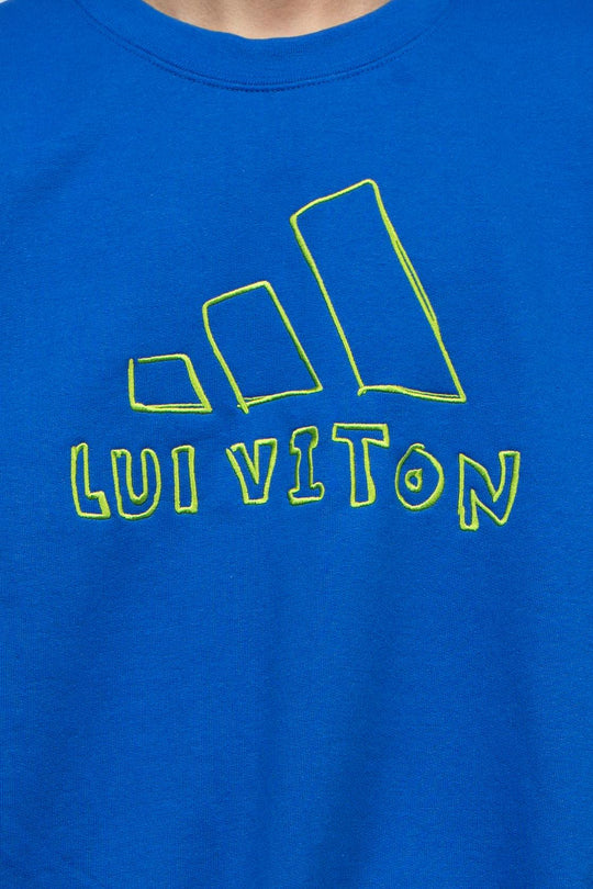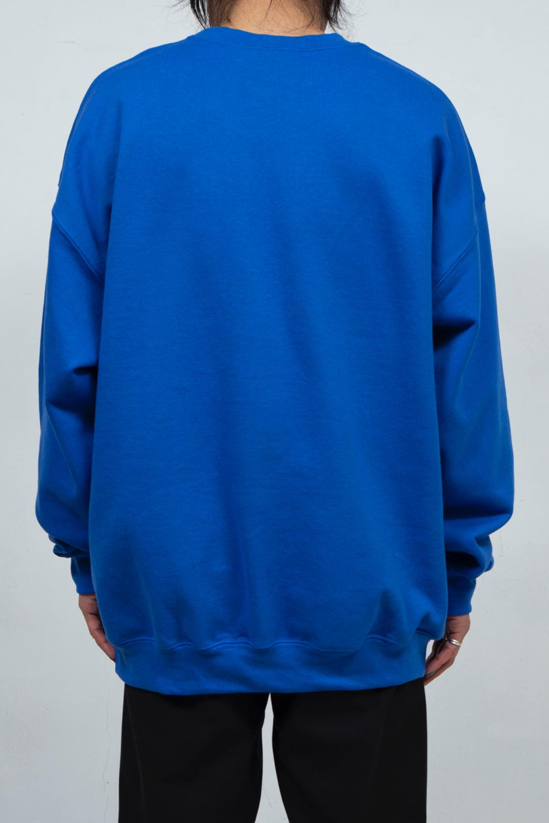 カタカナ発音のスペル間違いロゴと、スポーツメーカー風マークが落書きされたような刺繍のスウェット。