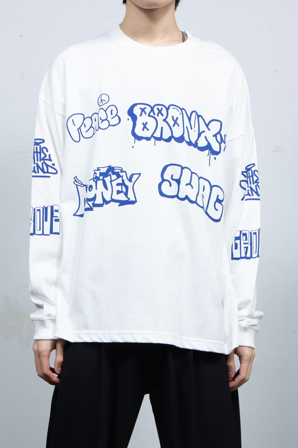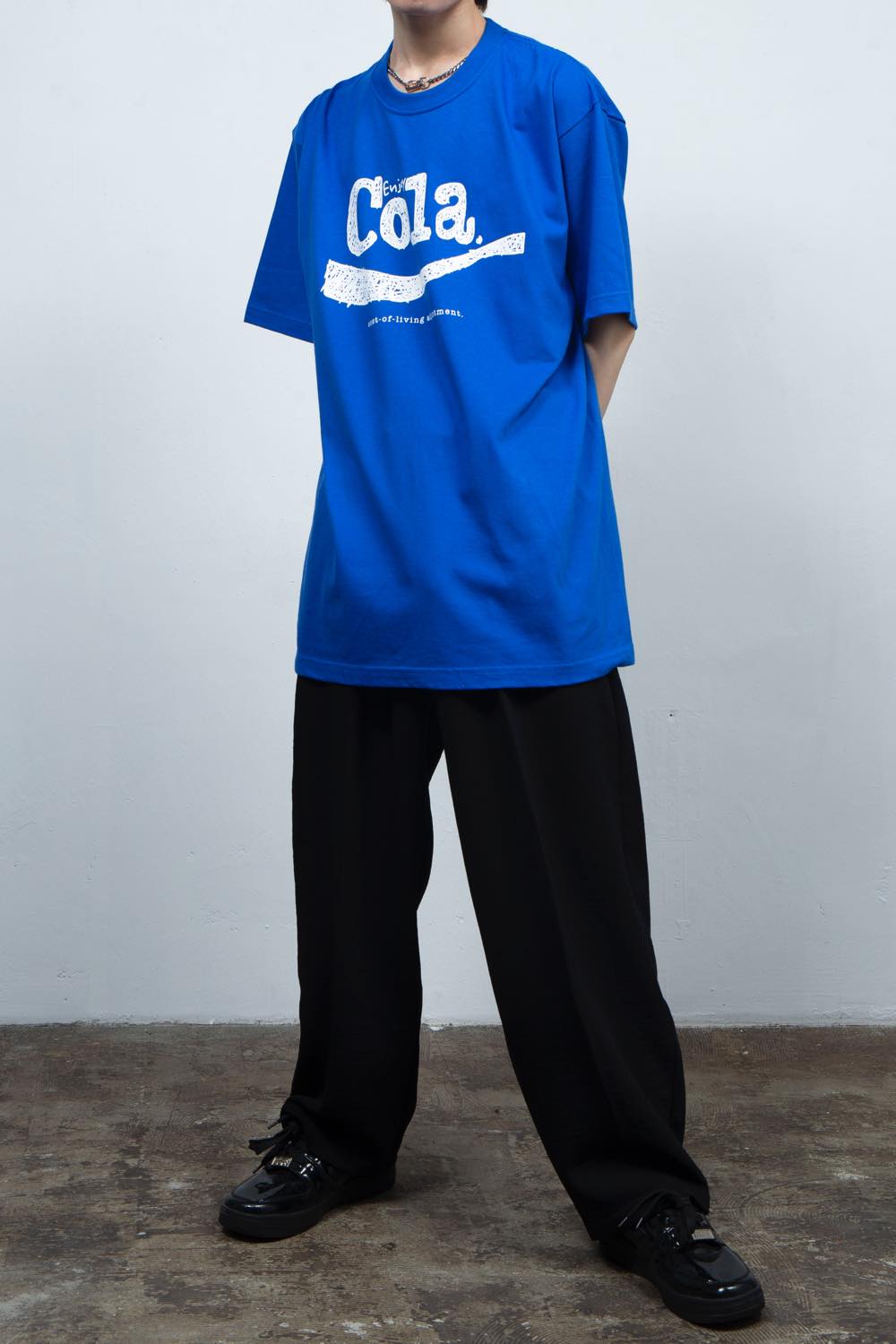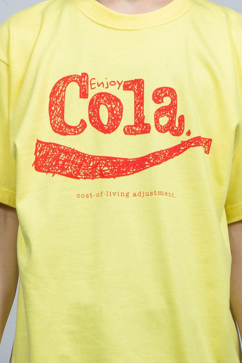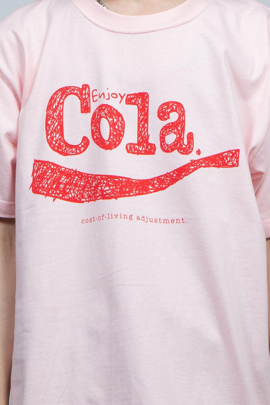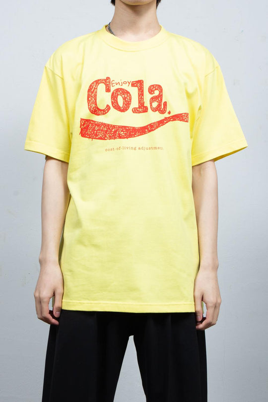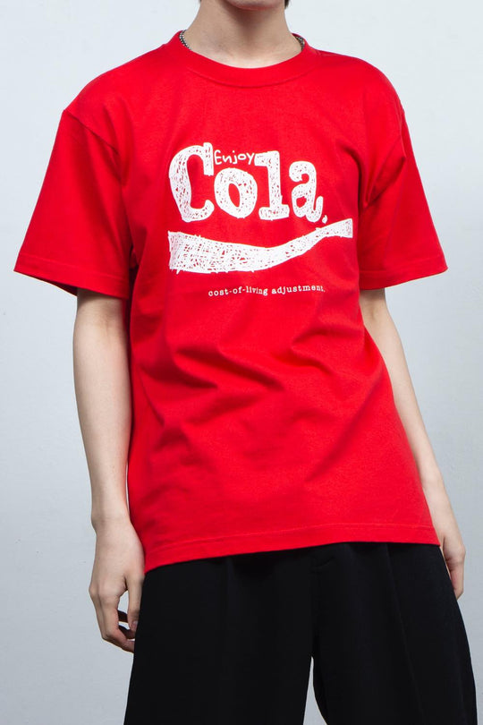 前面胸元にCOLA《cost-of-living adjustment》の清涼飲料水ロゴ風の落書きグラフィックをプリント。
