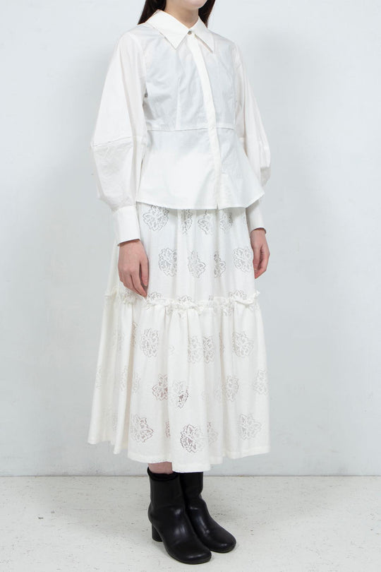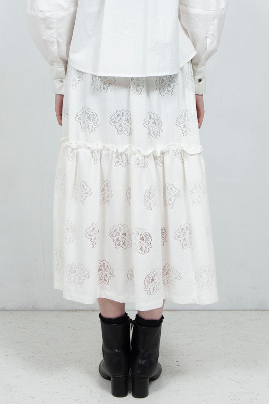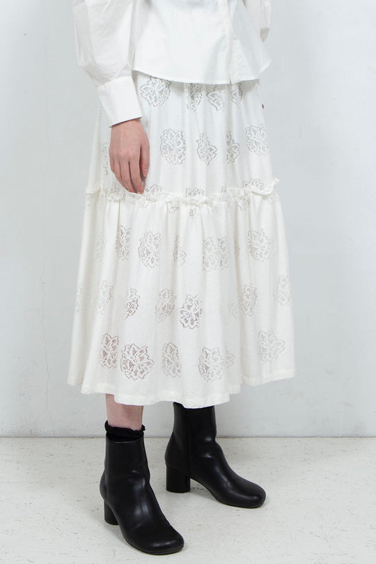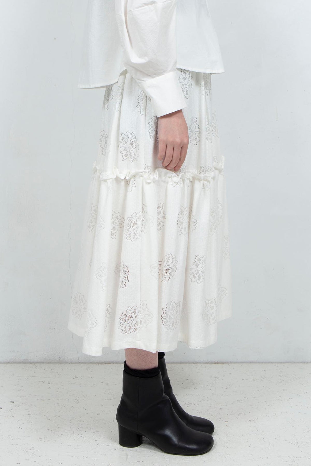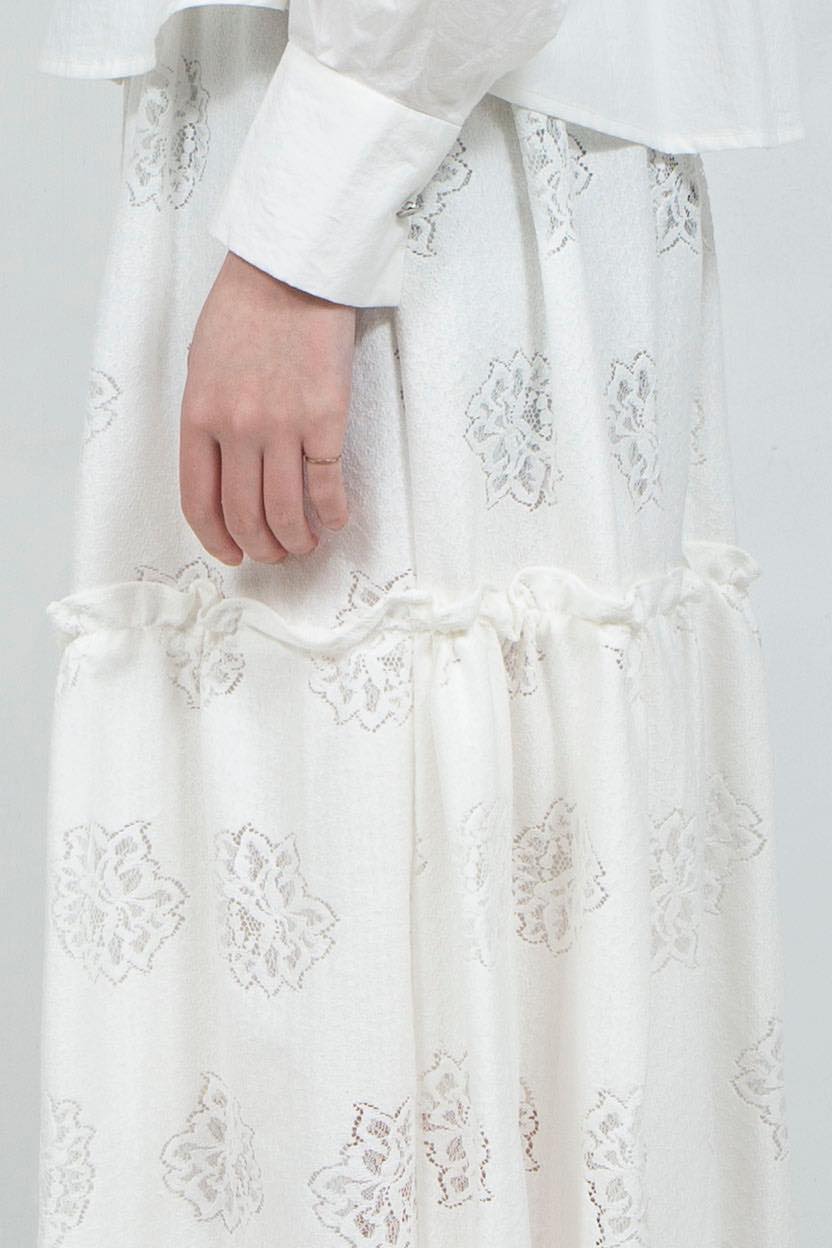 繊細なレースで花柄を表現したスカート。透け感のある涼しげな素材感で、ペチコート付き。