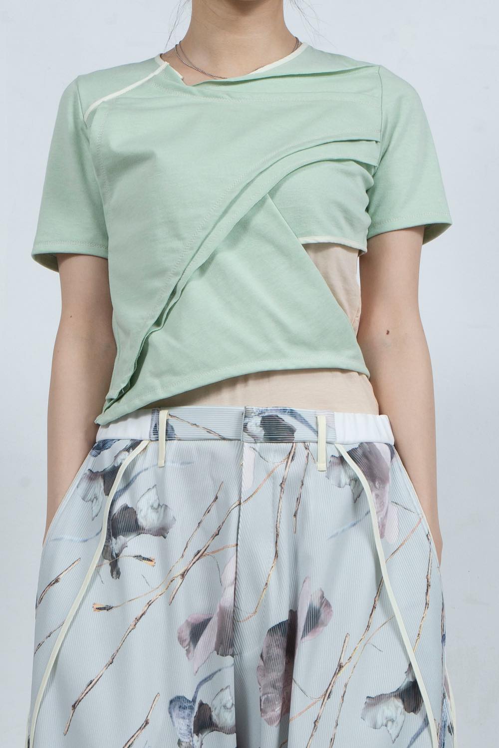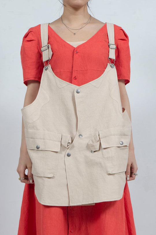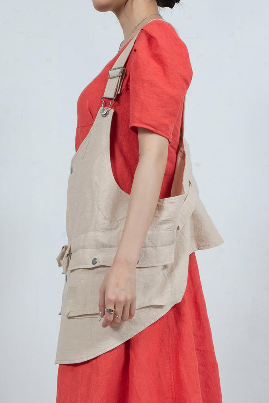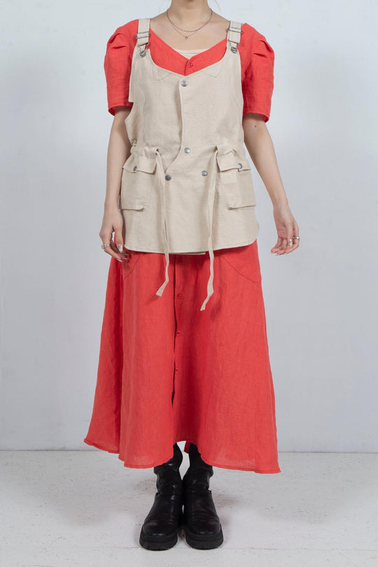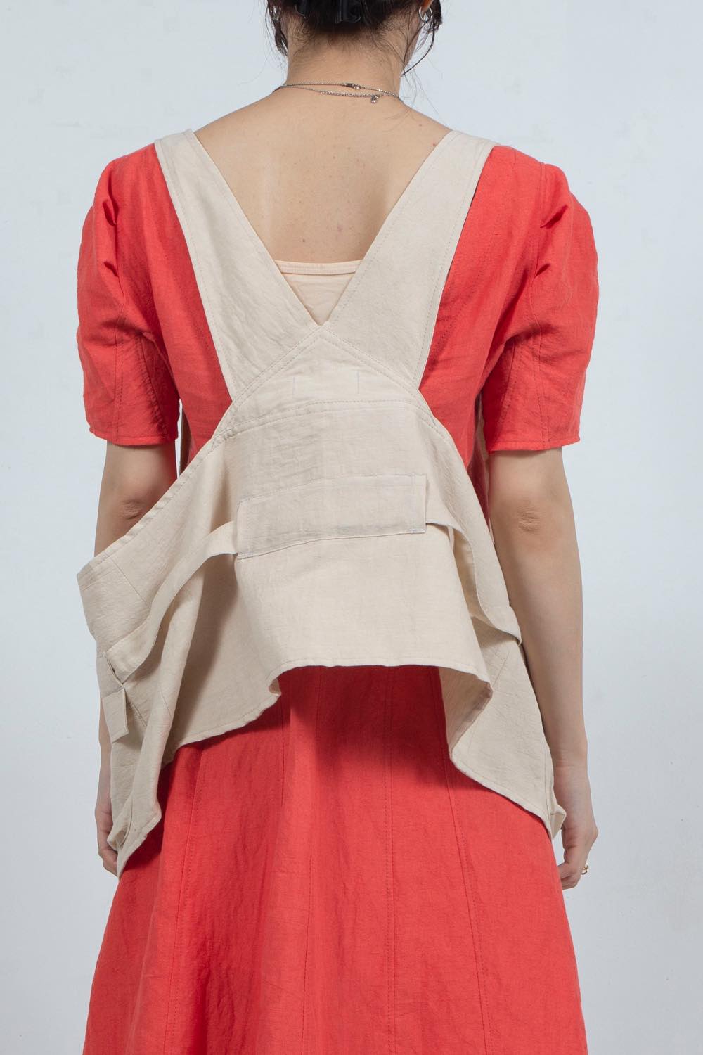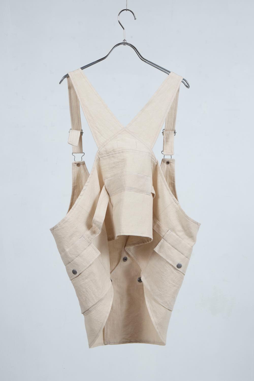 地形をシーチングに写し、立体裁断で制作したベスト。地形に生地を足した部分は切り替え線を残し、元の形を強調したデザイン。身幅をゆったりとっているので、コートの上から着ることも出来、カットソー等の上に着る場合はコードで身頃をタックにする事でサイズを調節できます。