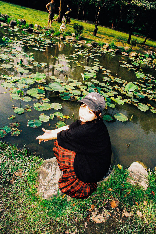 ウォッシュドデニムのキャップ。フロントには今回のテーマであるRaw Love(ㄞˋ)、バックにはNERIAME(内麗亜美)の注音符号を刺繍しました。これは中国語で外来語の表記を決める際、似ている音の漢字を当て字にする風習があるのですが、アジアは美しいという意味を込めました。