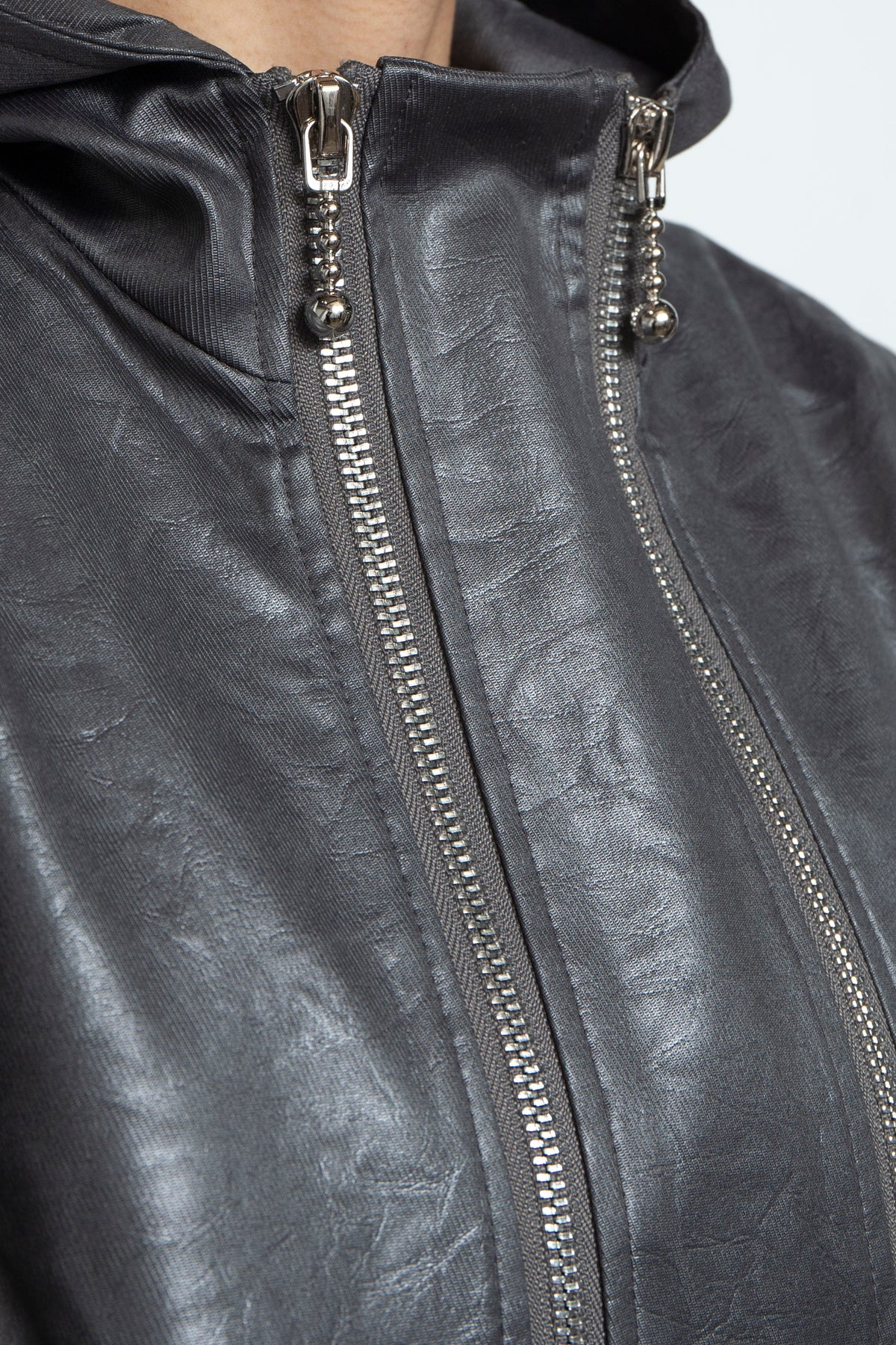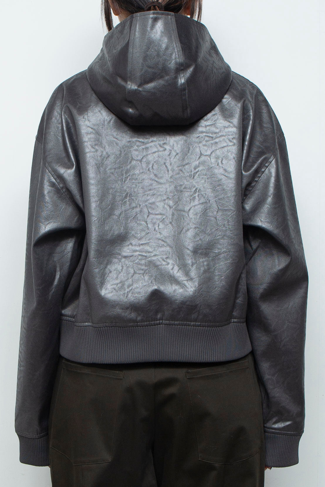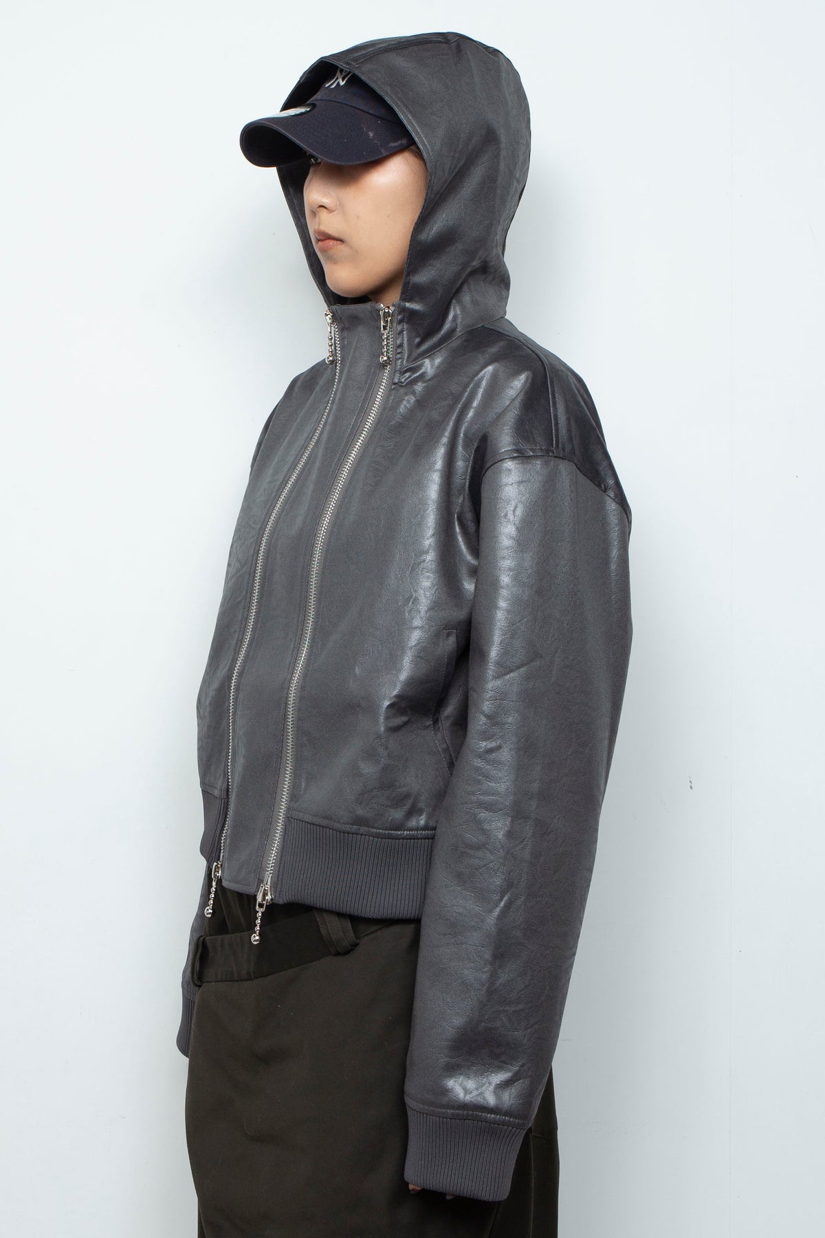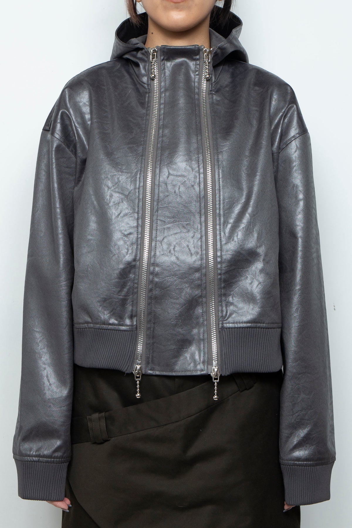 フェイクレザーのフーデッドジャケット。前見頃の両サイドのジップはどちらも使用可能でダブルジップ仕様です。