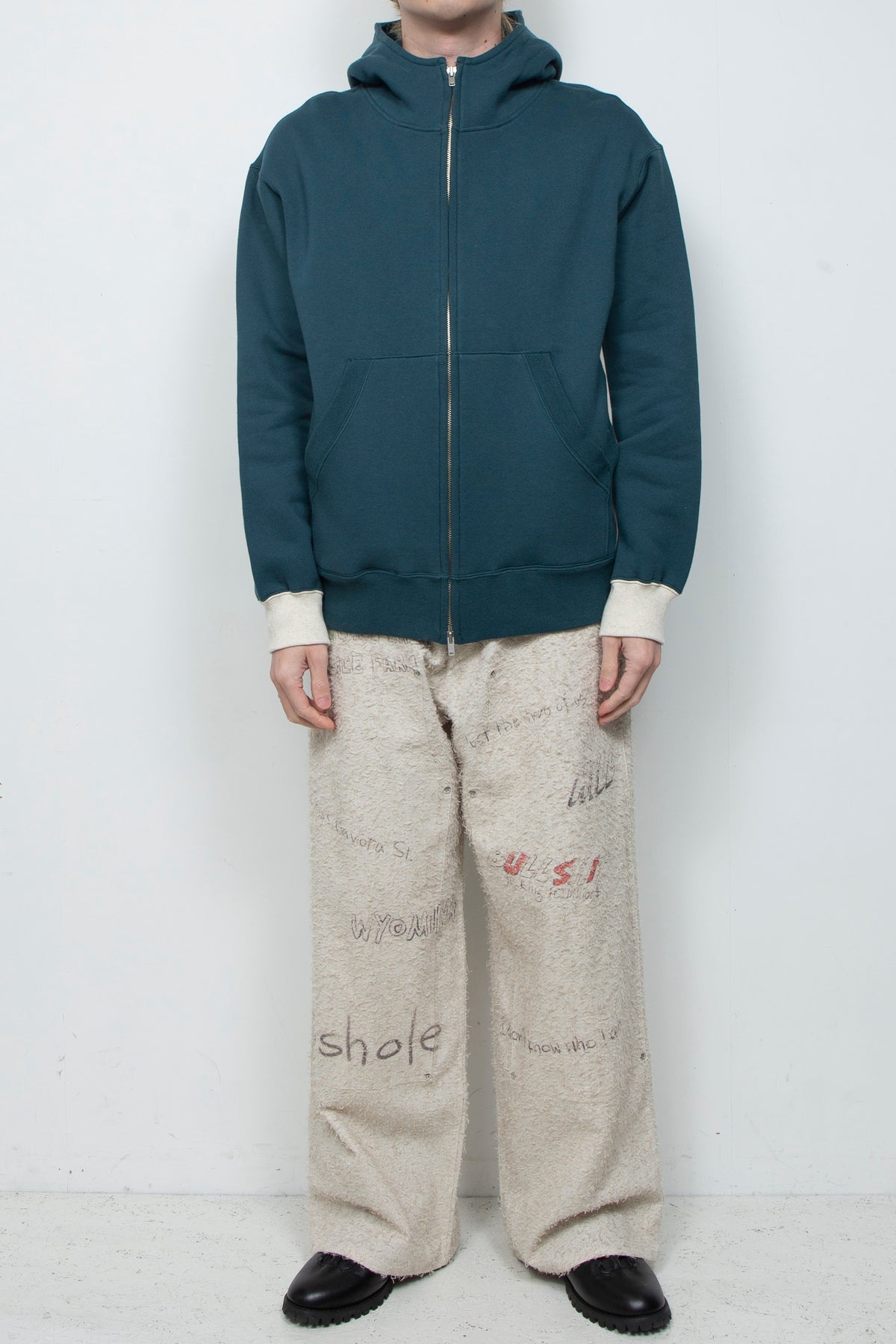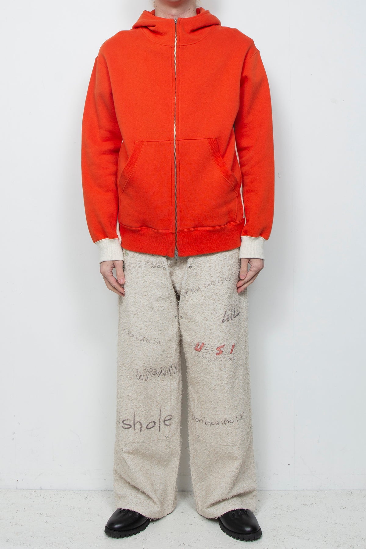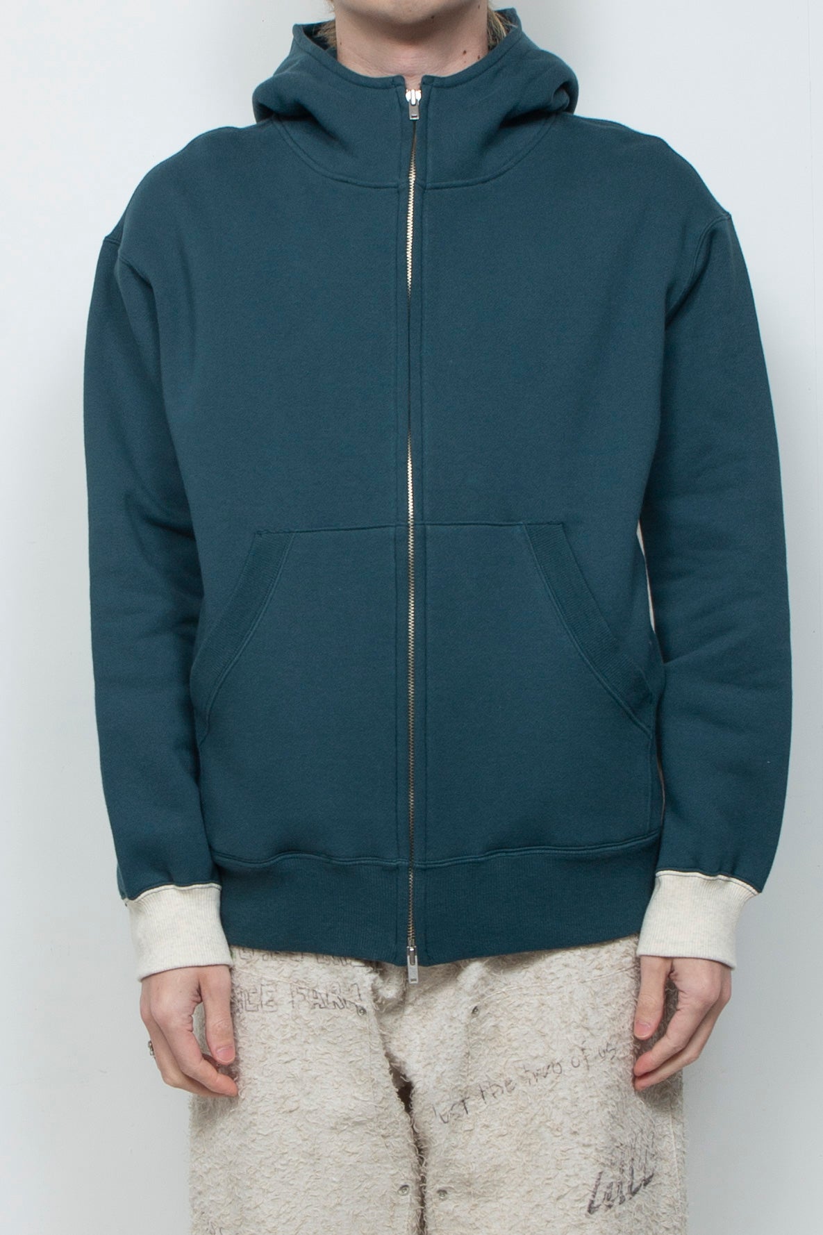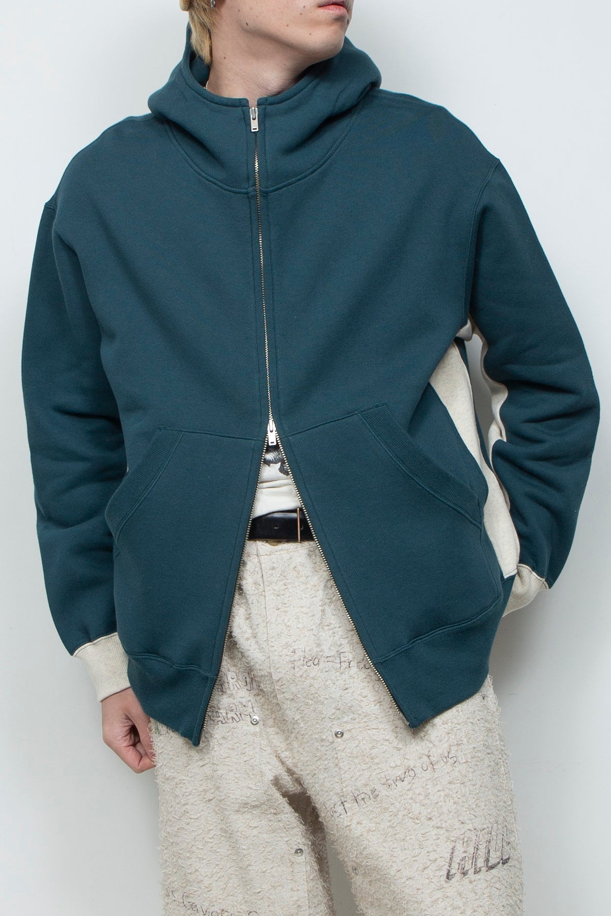 2トーンの切り替えが特徴のジップフーディー。左右にポケットつきで、ダブルジップを採用。フードの前襟が少し高いデザインです。