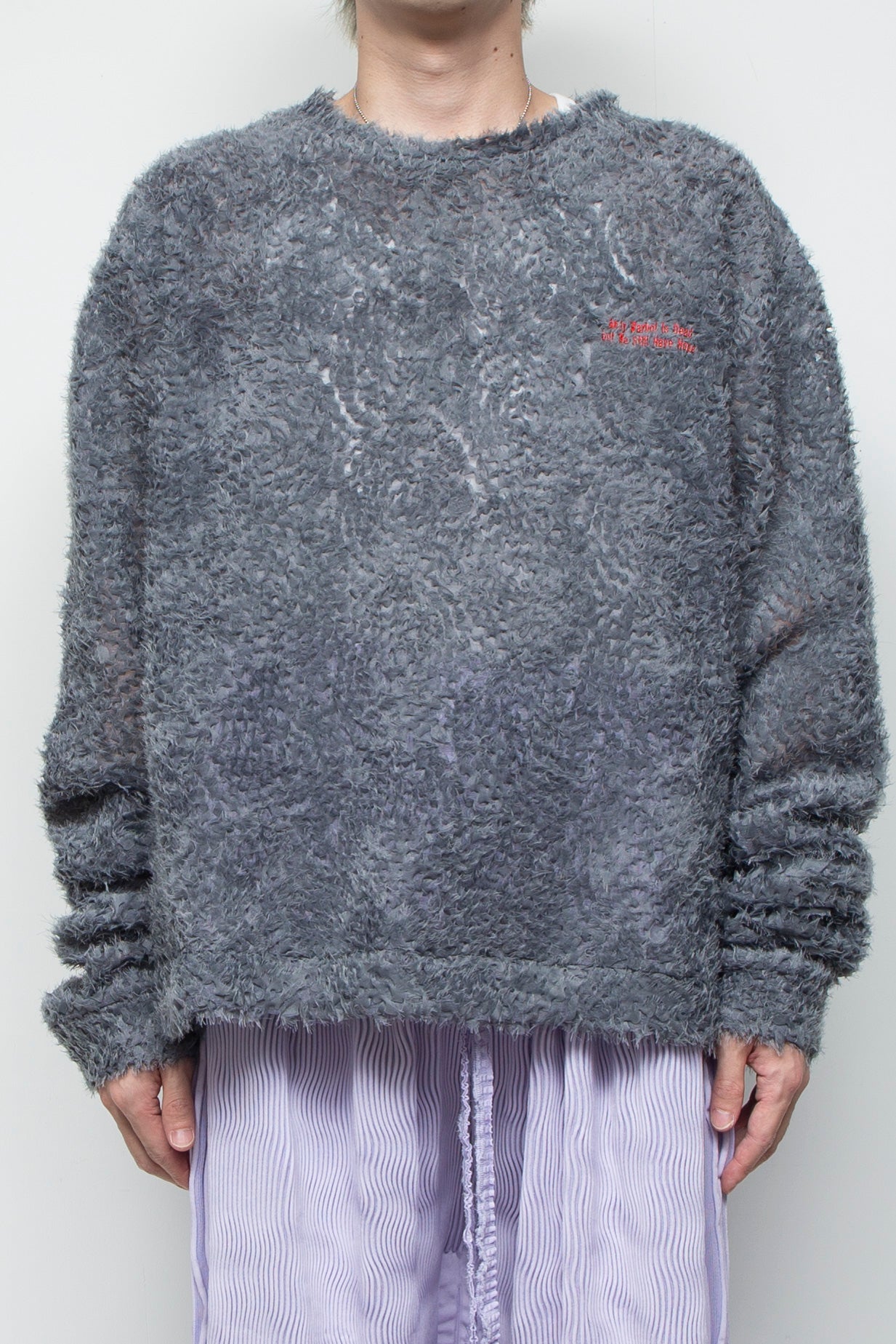 テーマの一部である『Andy Warhol Is Dead but We Still Have Hope』の刺繍が、さりげないアクセントになっています。