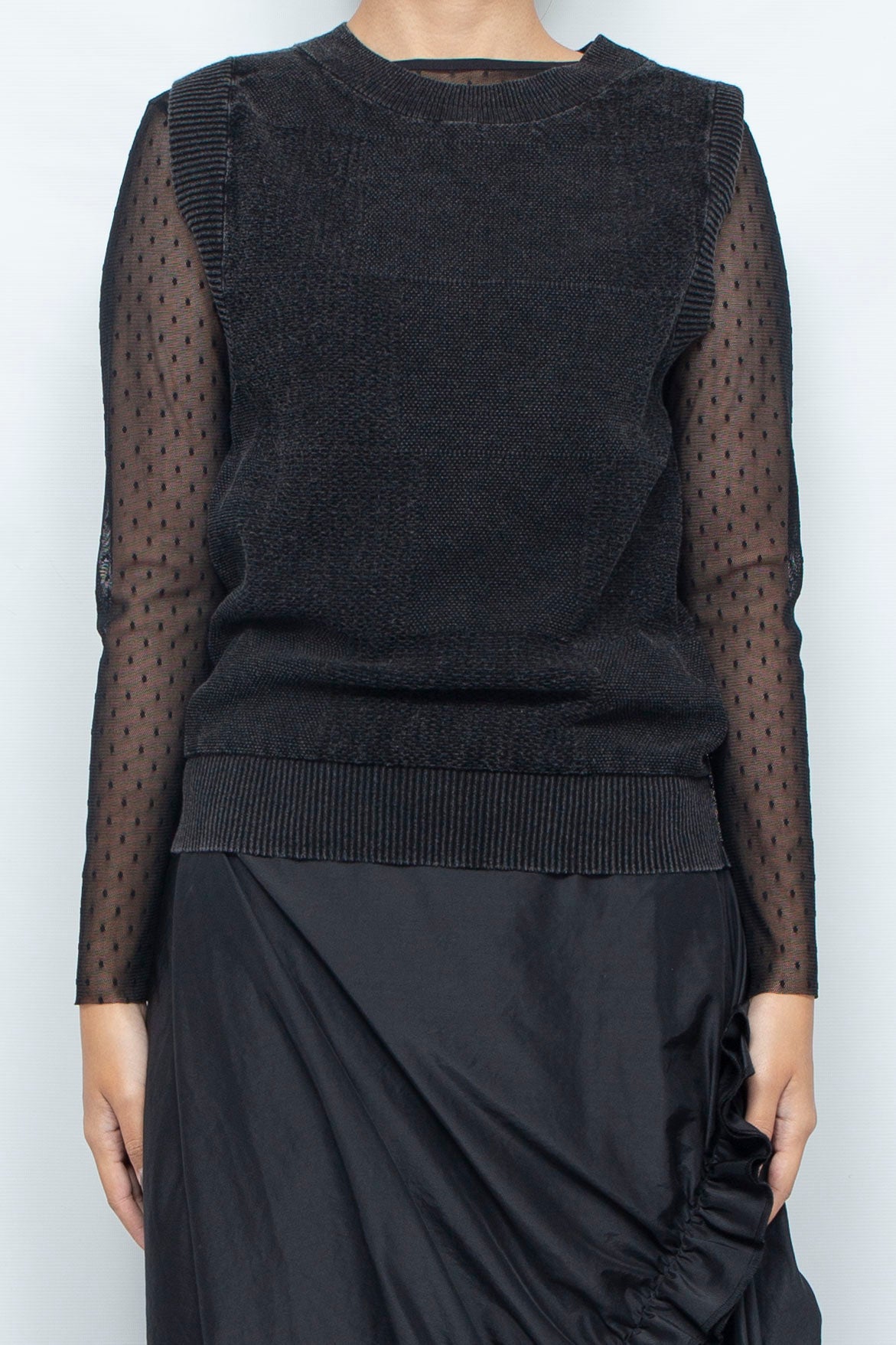 デニム風加工が施されたニットベスト。
