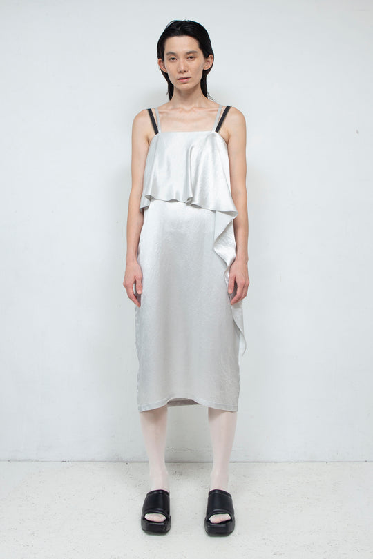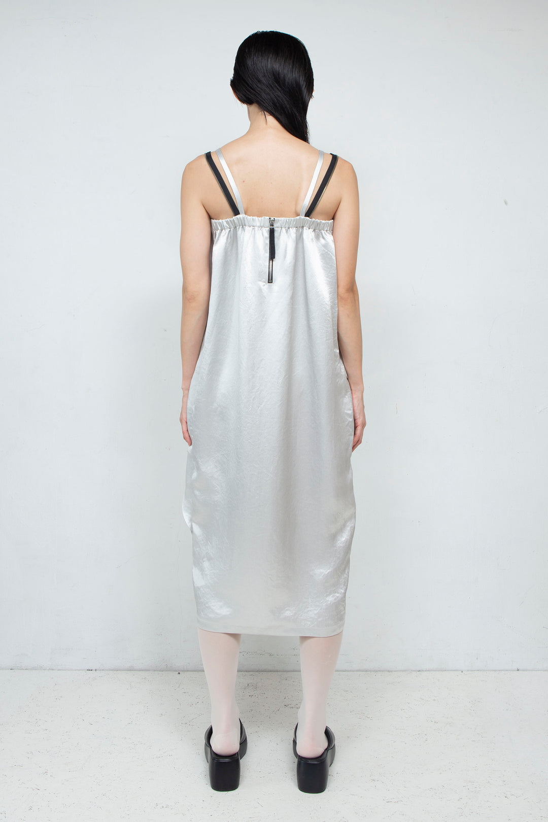 ミニマルなデザインのワンピースドレス。光沢のある生地感とシンメトリーなドレープが品のある雰囲気に。