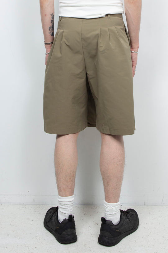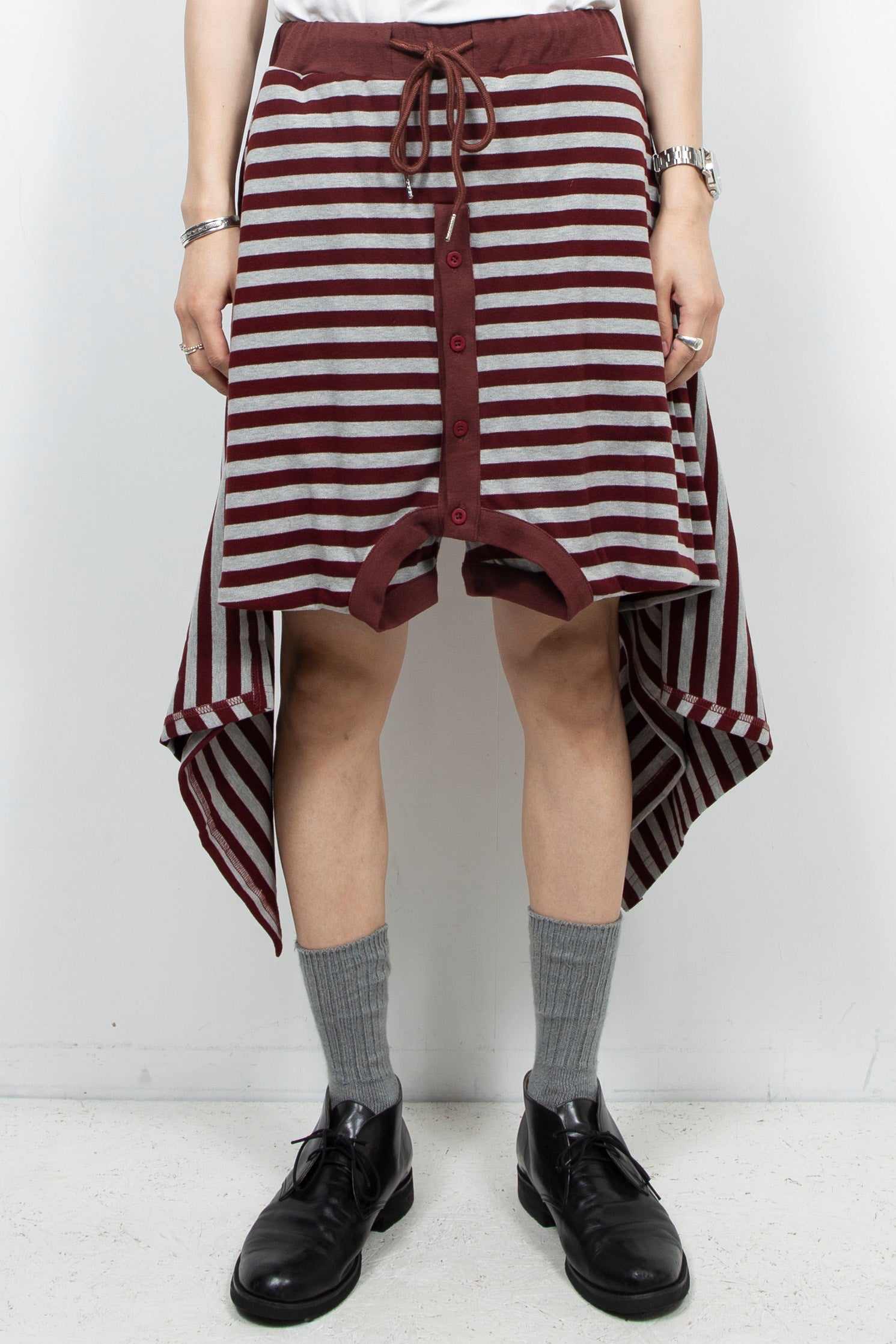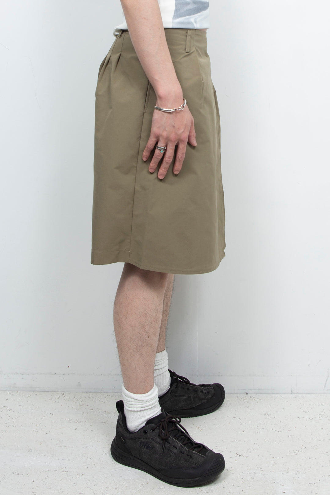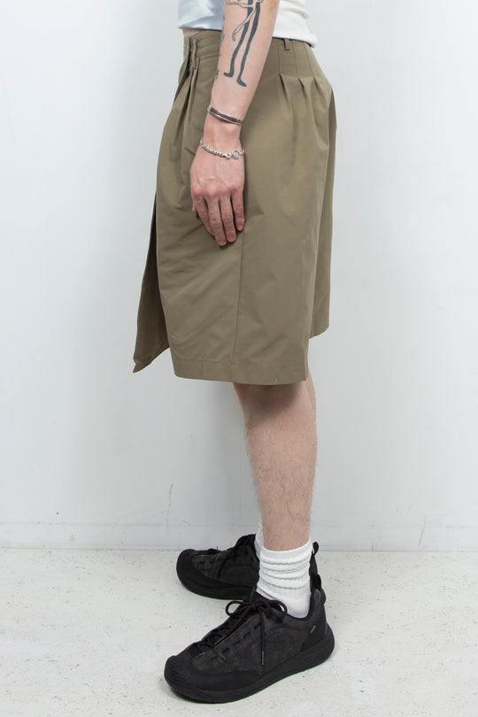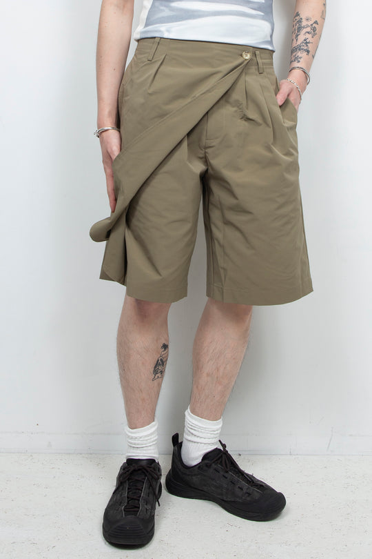 ラップスカートのようにショーツをボタンで留める仕様で、スカートとパンツの境界を曖昧にし、ニュートラルな雰囲気に。