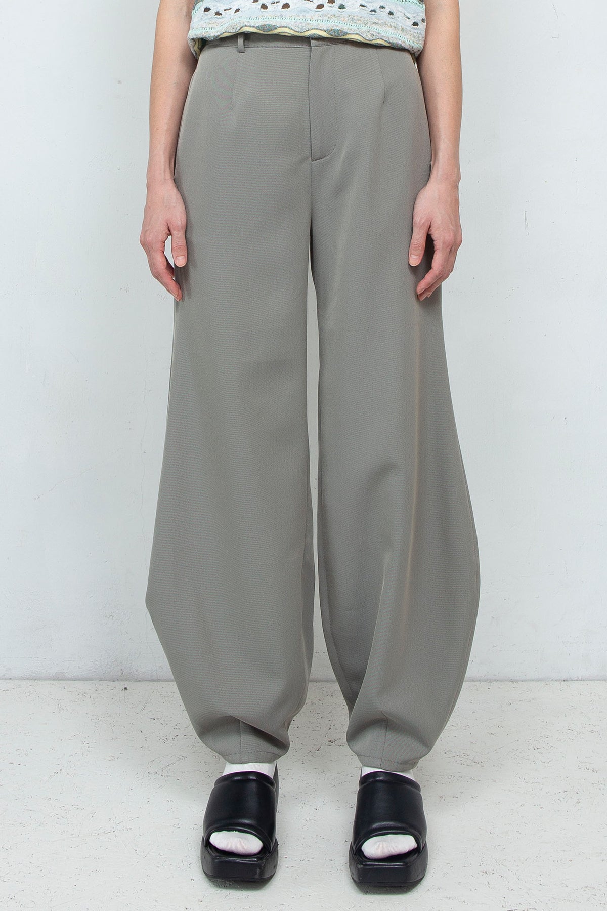脱構築と再構築のアイデアから、クラシックなストライプ柄スウェットシャツのリブ襟とアームホールを解体し、パンツのパーツとして再構築。「服とパンツの共生」という興味深いデザインに。