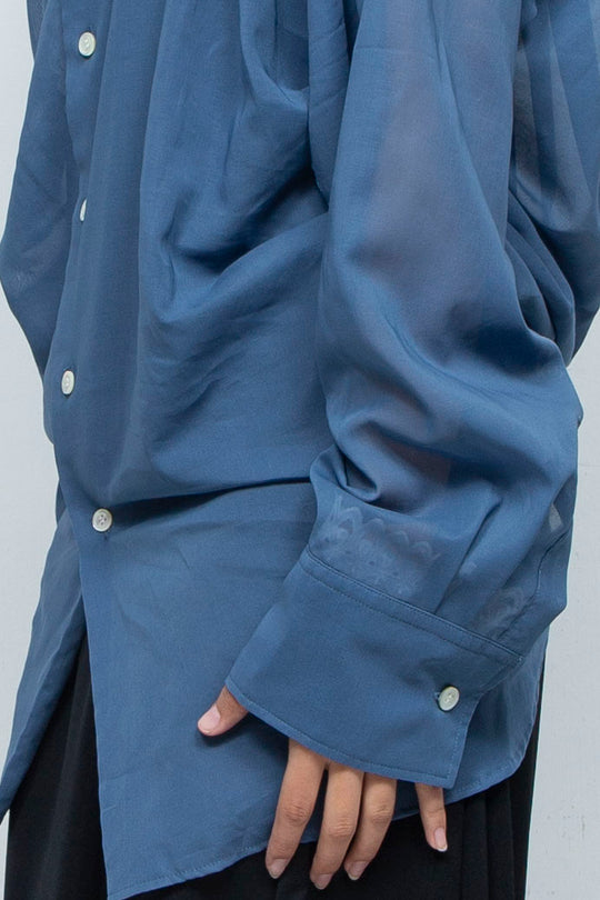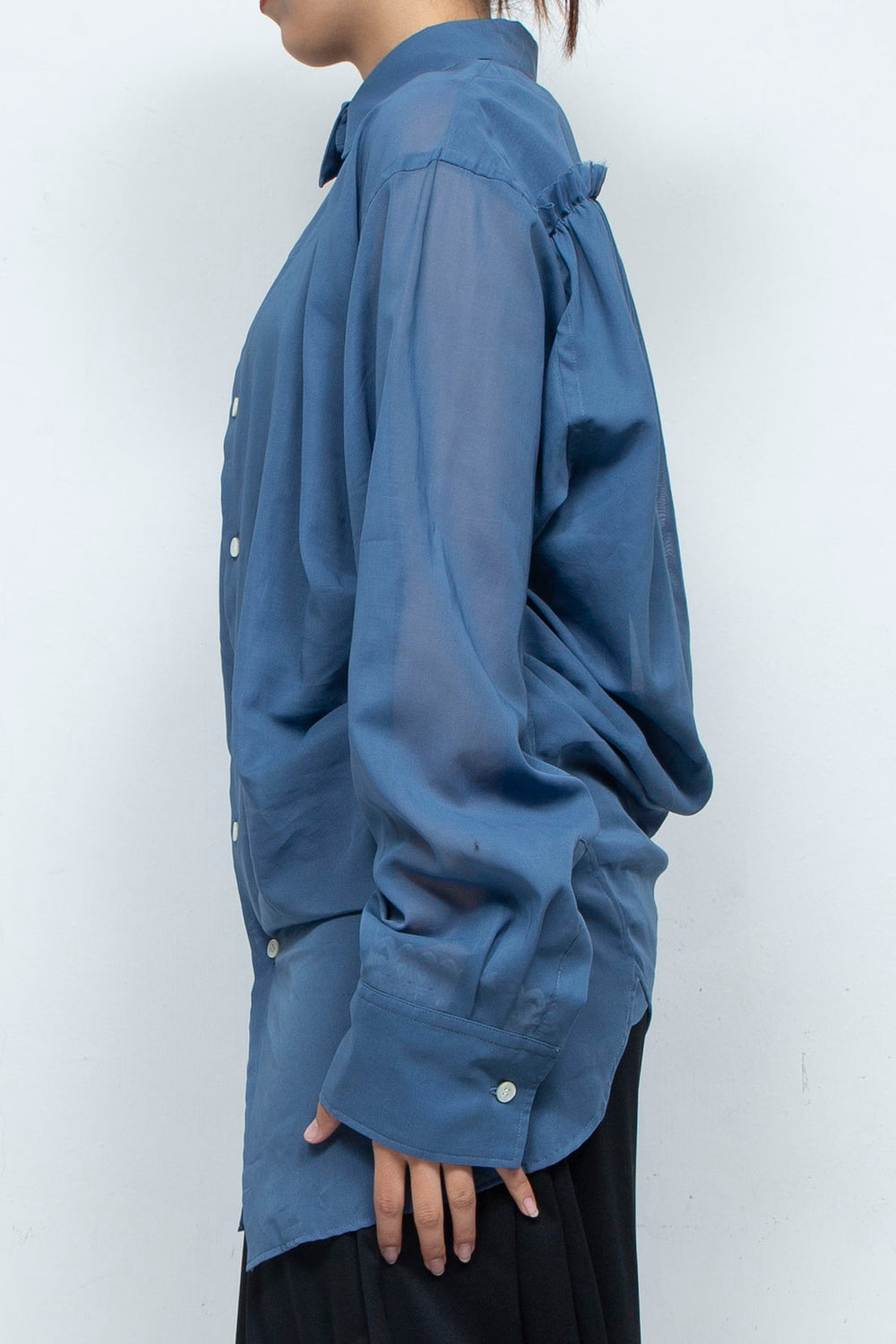 バックサイドのドレープが特徴のシアー素材のシャツ。