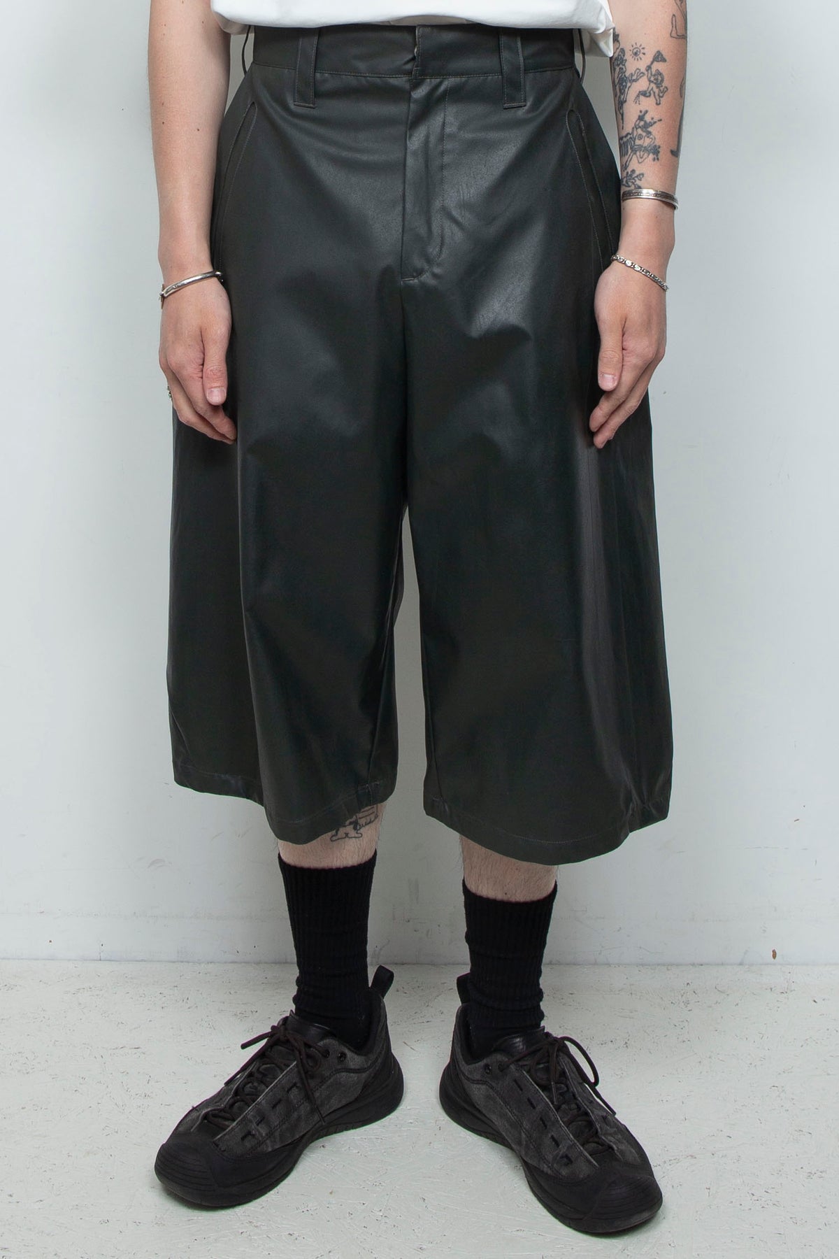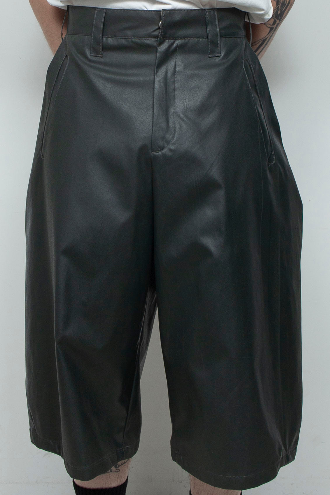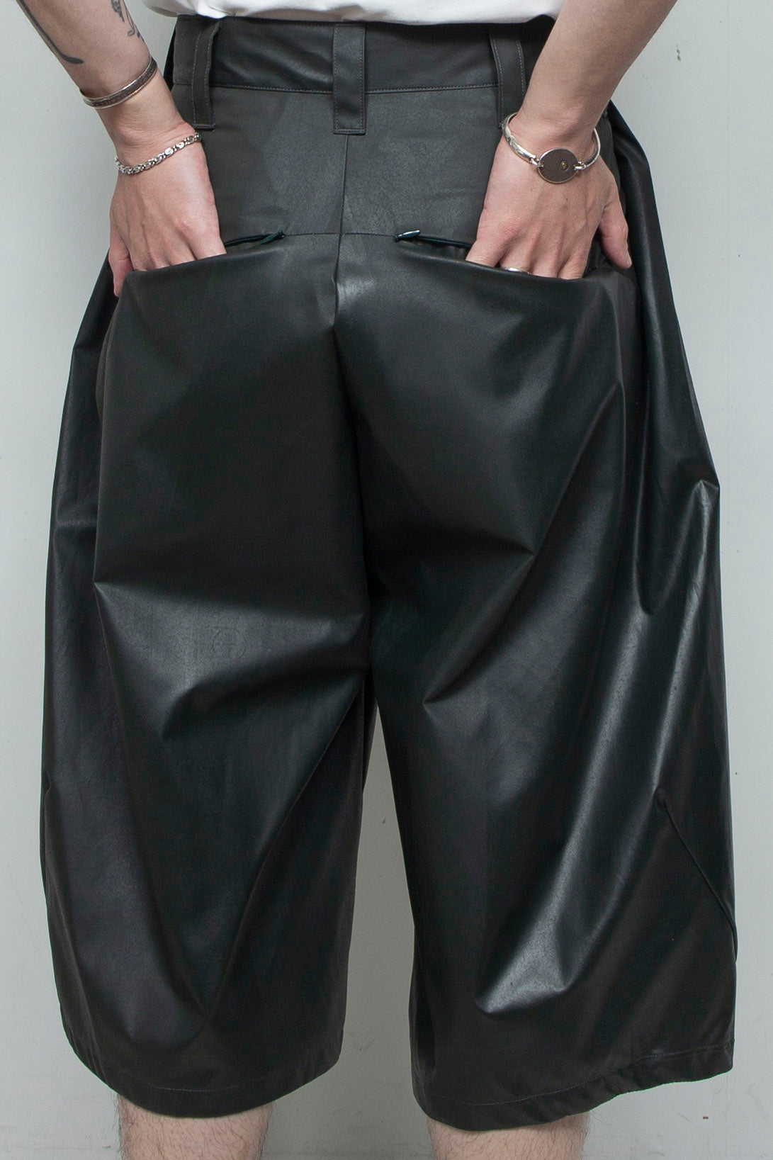 起毛感のある化学繊維に、手作業でラバーインクを塗布したショートパンツ。