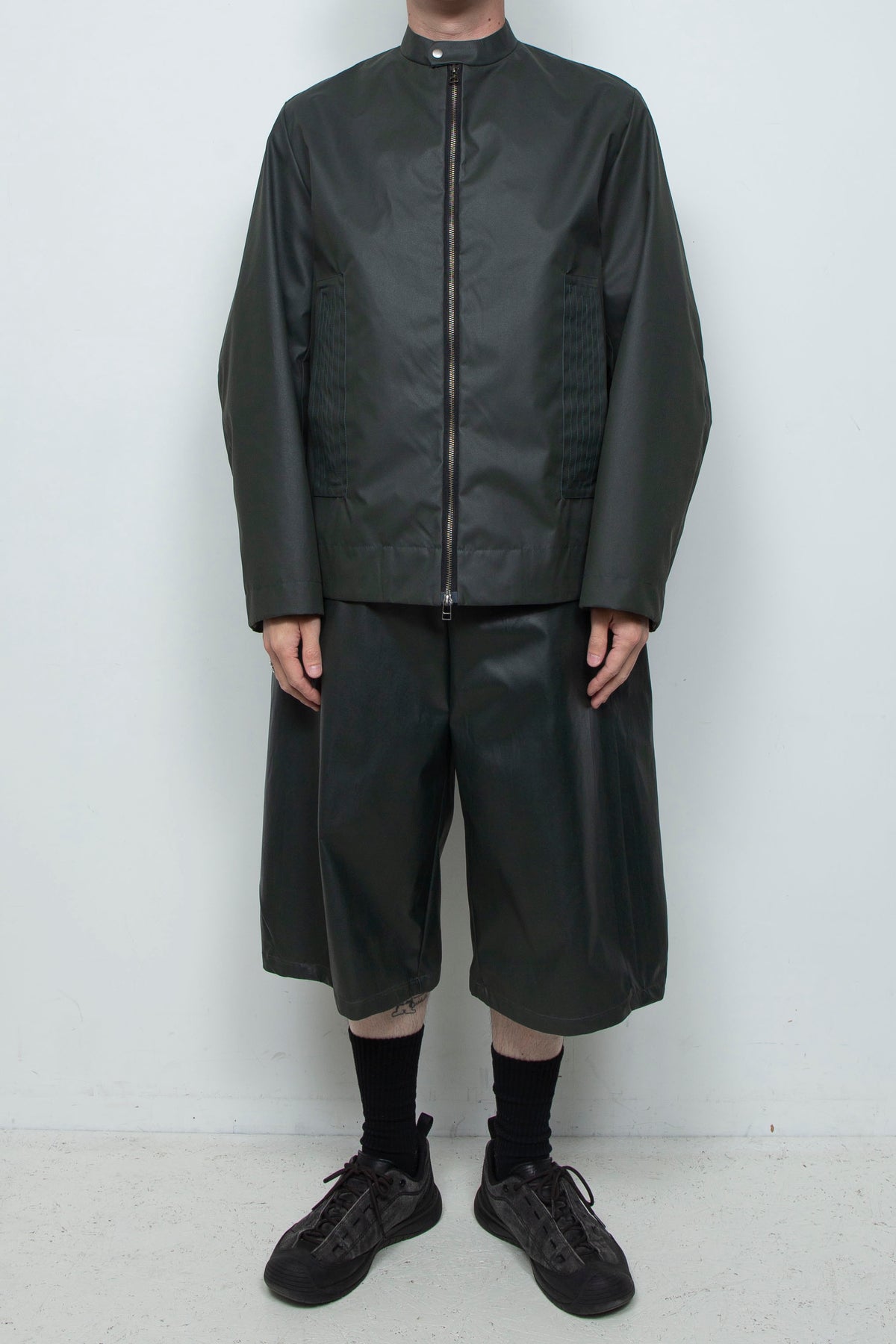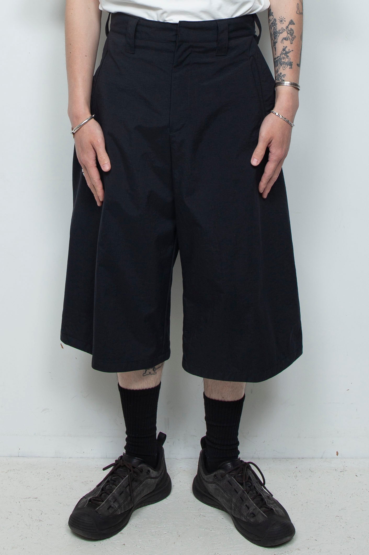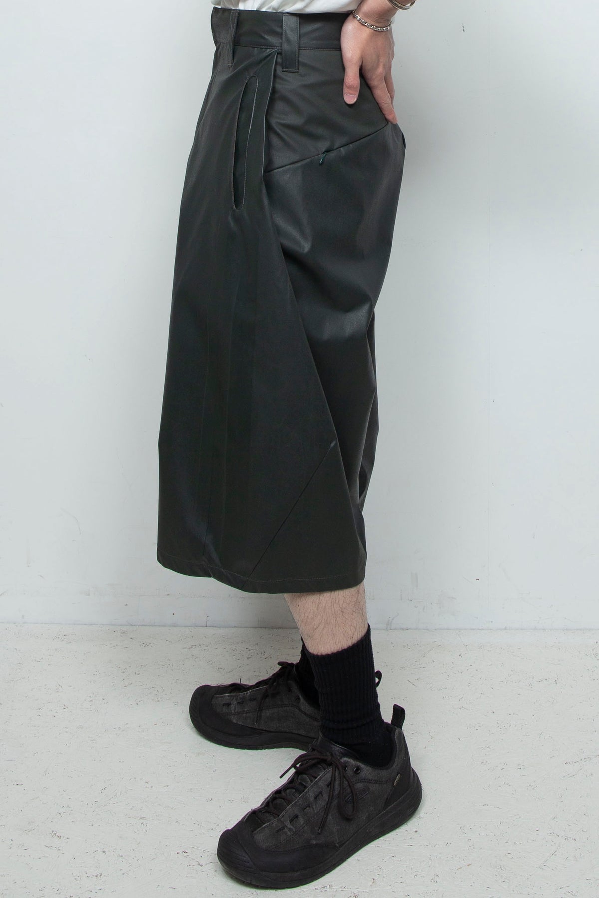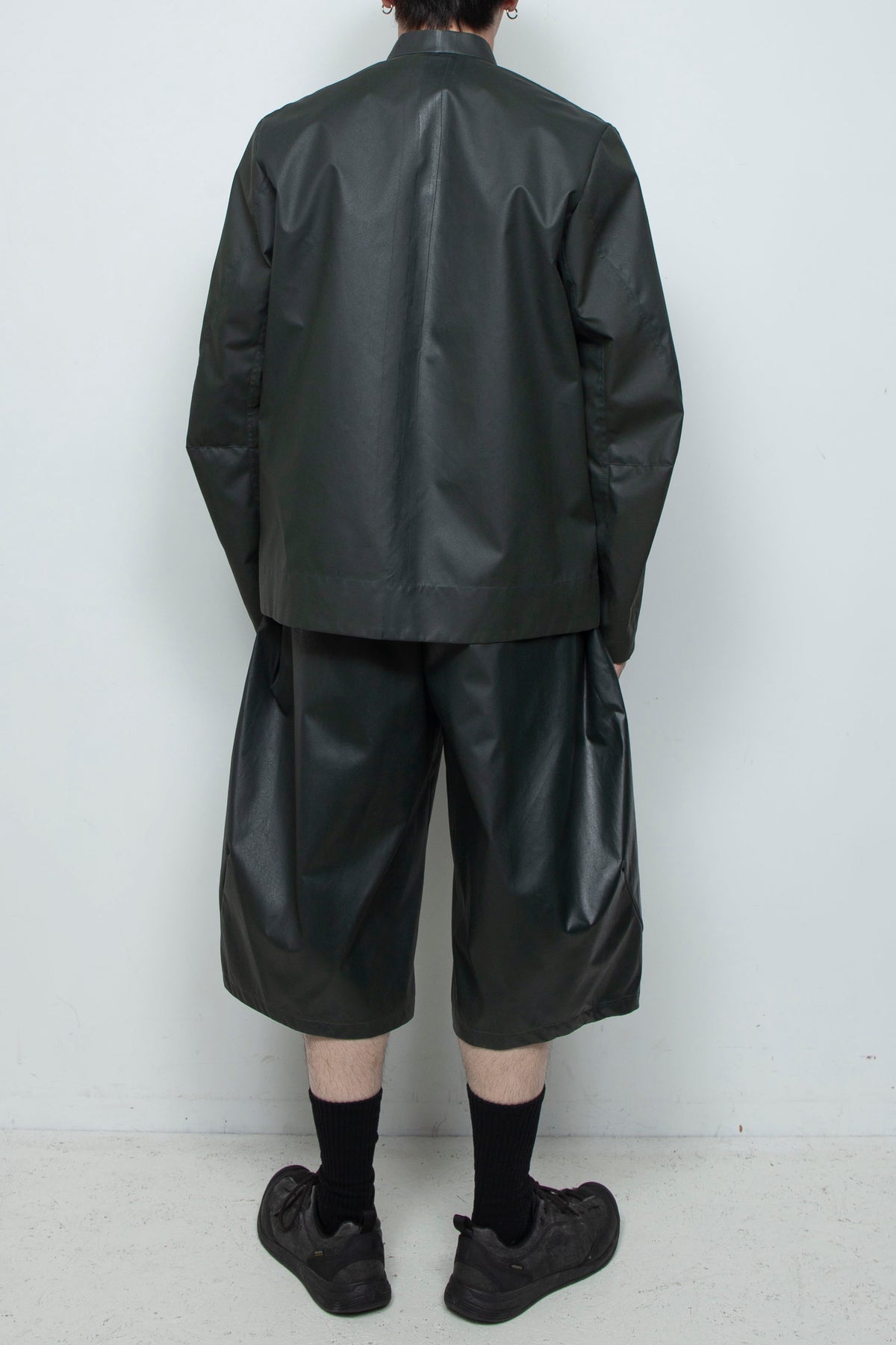 起毛感のある化学繊維に、手作業でラバーインクを塗布したショートパンツ。
