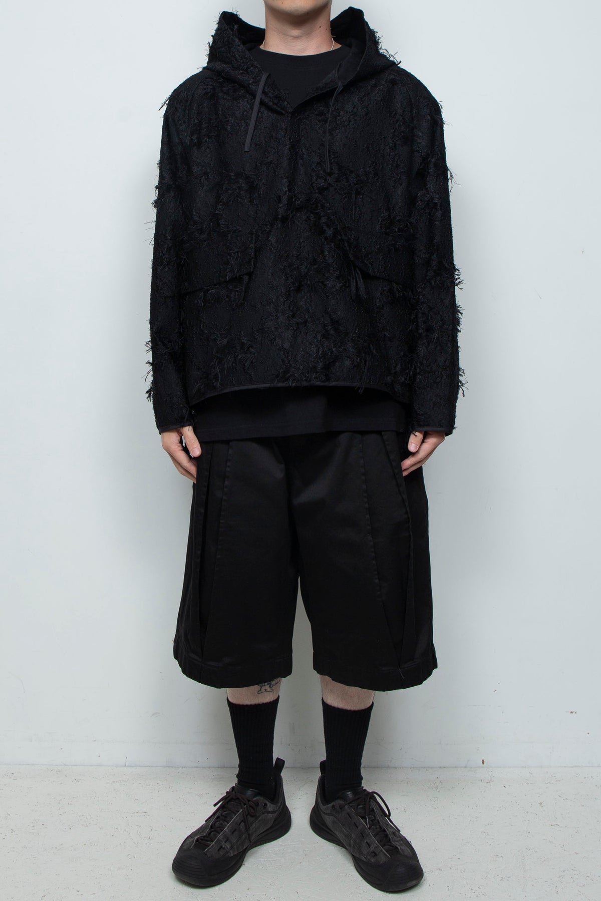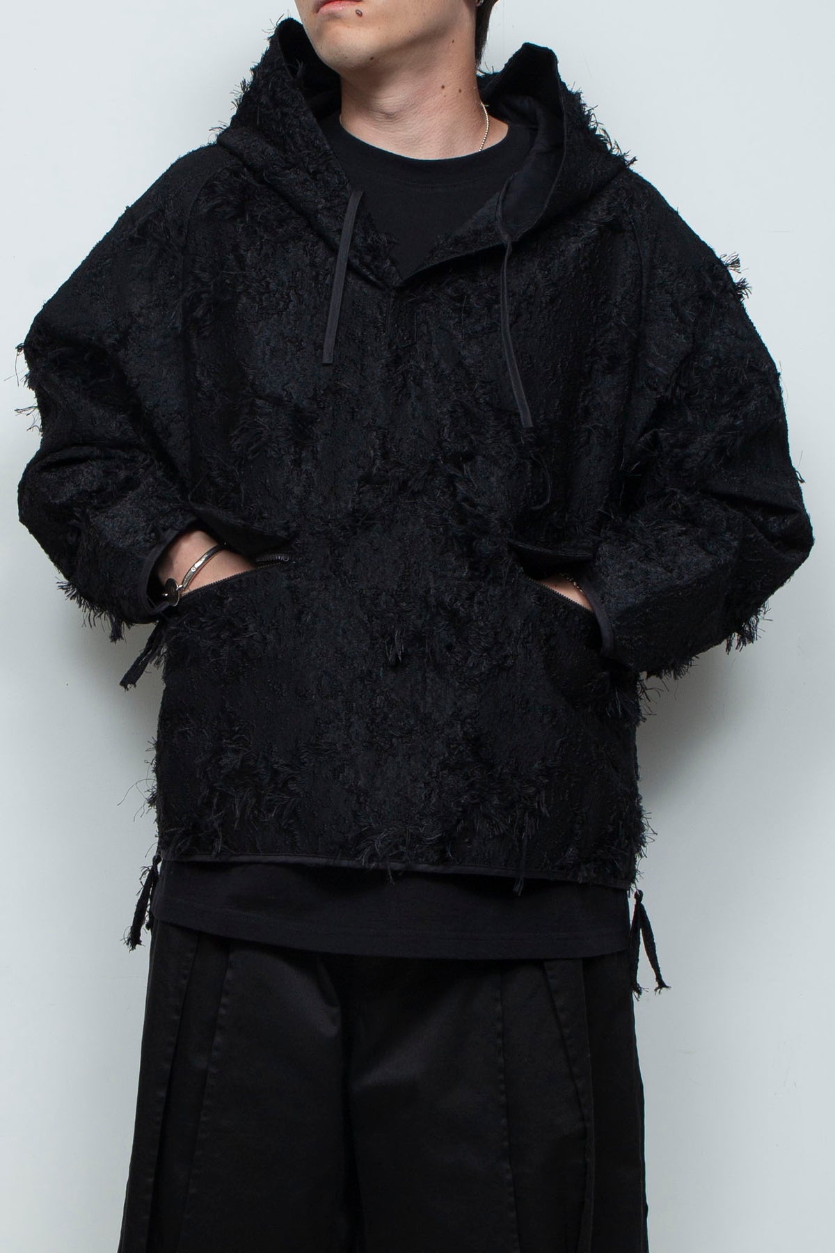 経糸にフィラメント糸(連続した長い繊維で構成された糸)を、緯糸に綿糸を使用したビアードジャガードを使用したアノラックです。