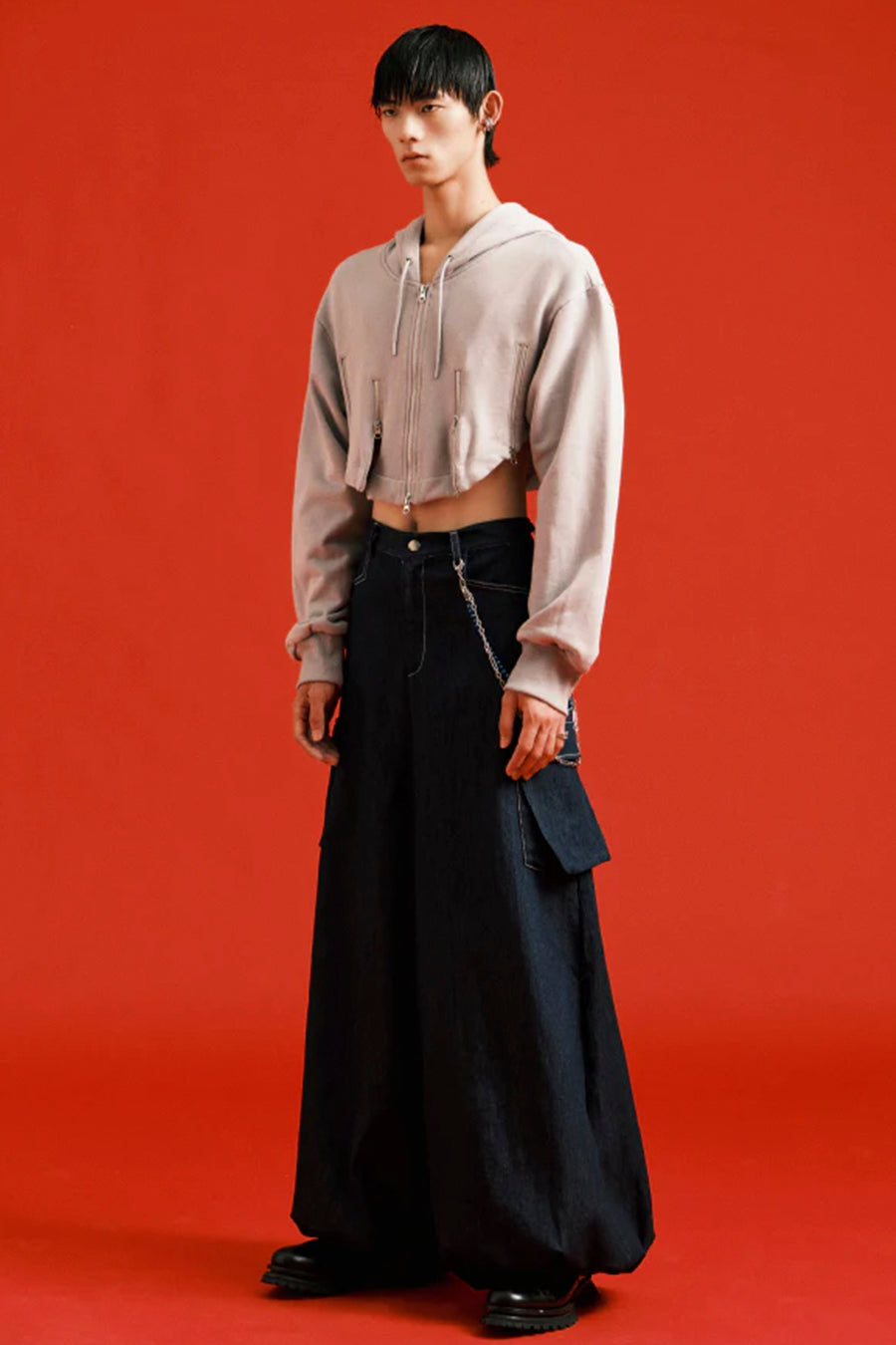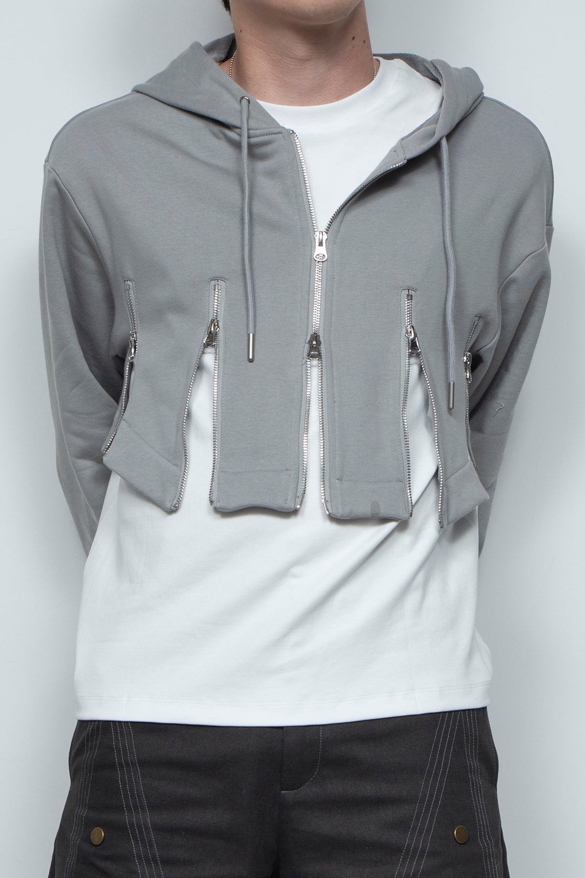前見頃にジッパーを5つ配したショート丈スウェットフーディー。メインの中央部分はダブルジップ仕様。