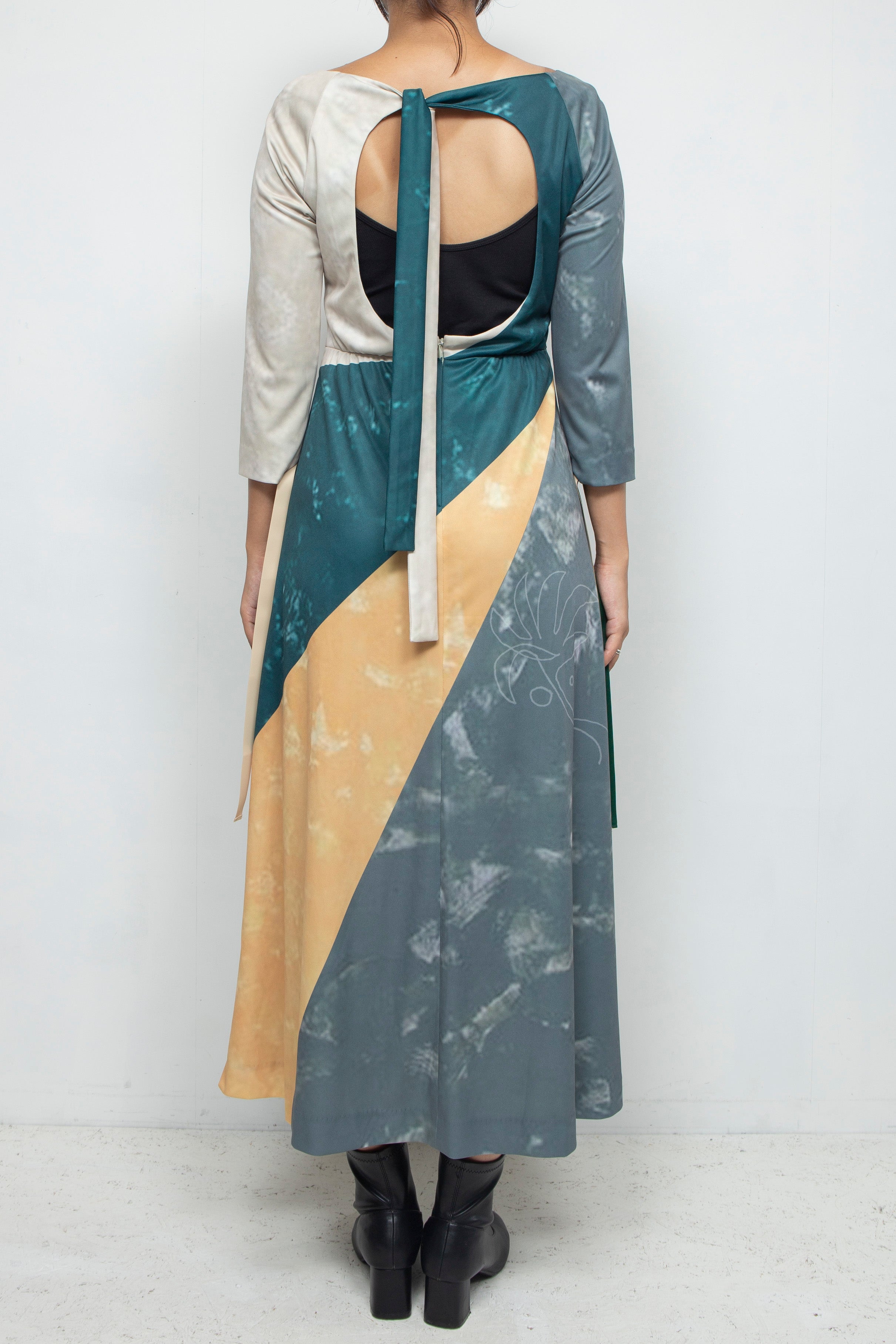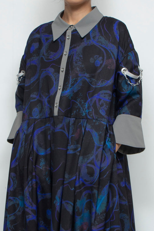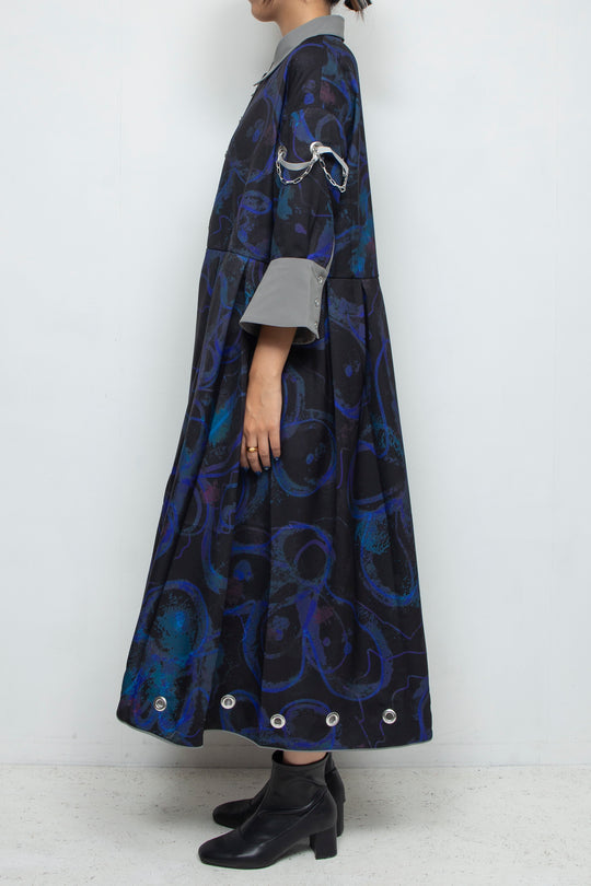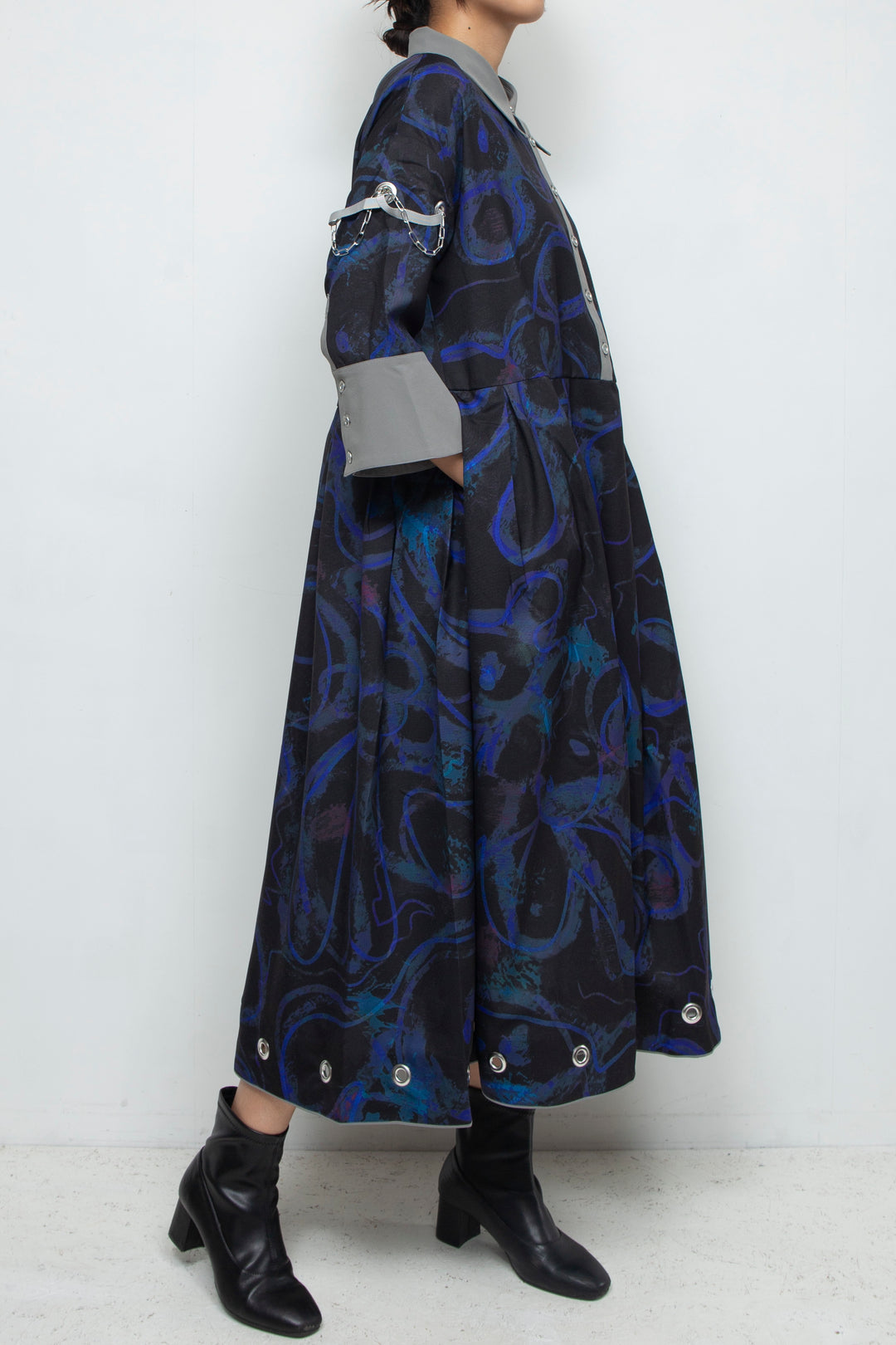 黒の地に浮かぶのは、連なりのある幻想的なブルーのドローイング。クラシックな形とユニークな柄のバランスが特徴的なワンピースです。