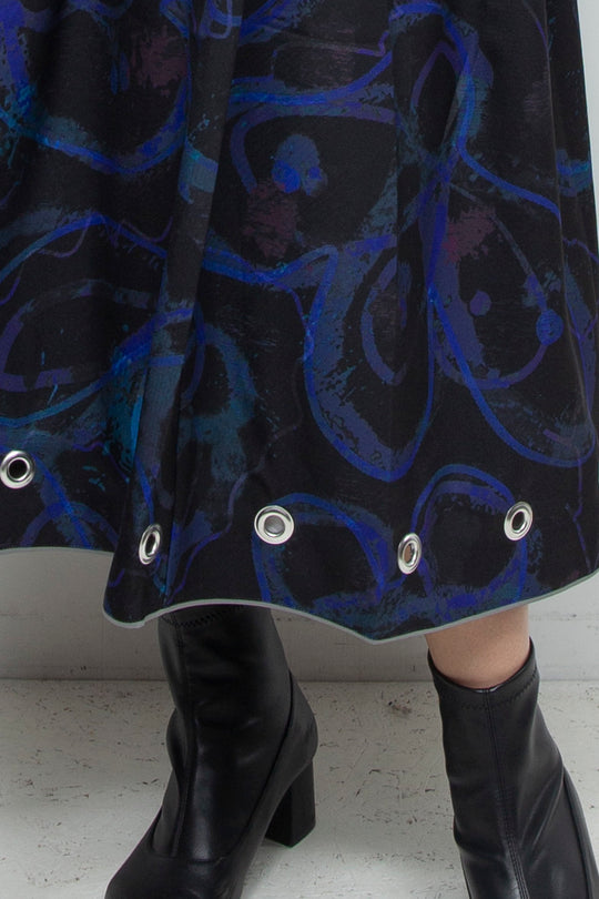 スカートはたっぷりとした布量で、裾に並んだシルバーのホールがポイントに。