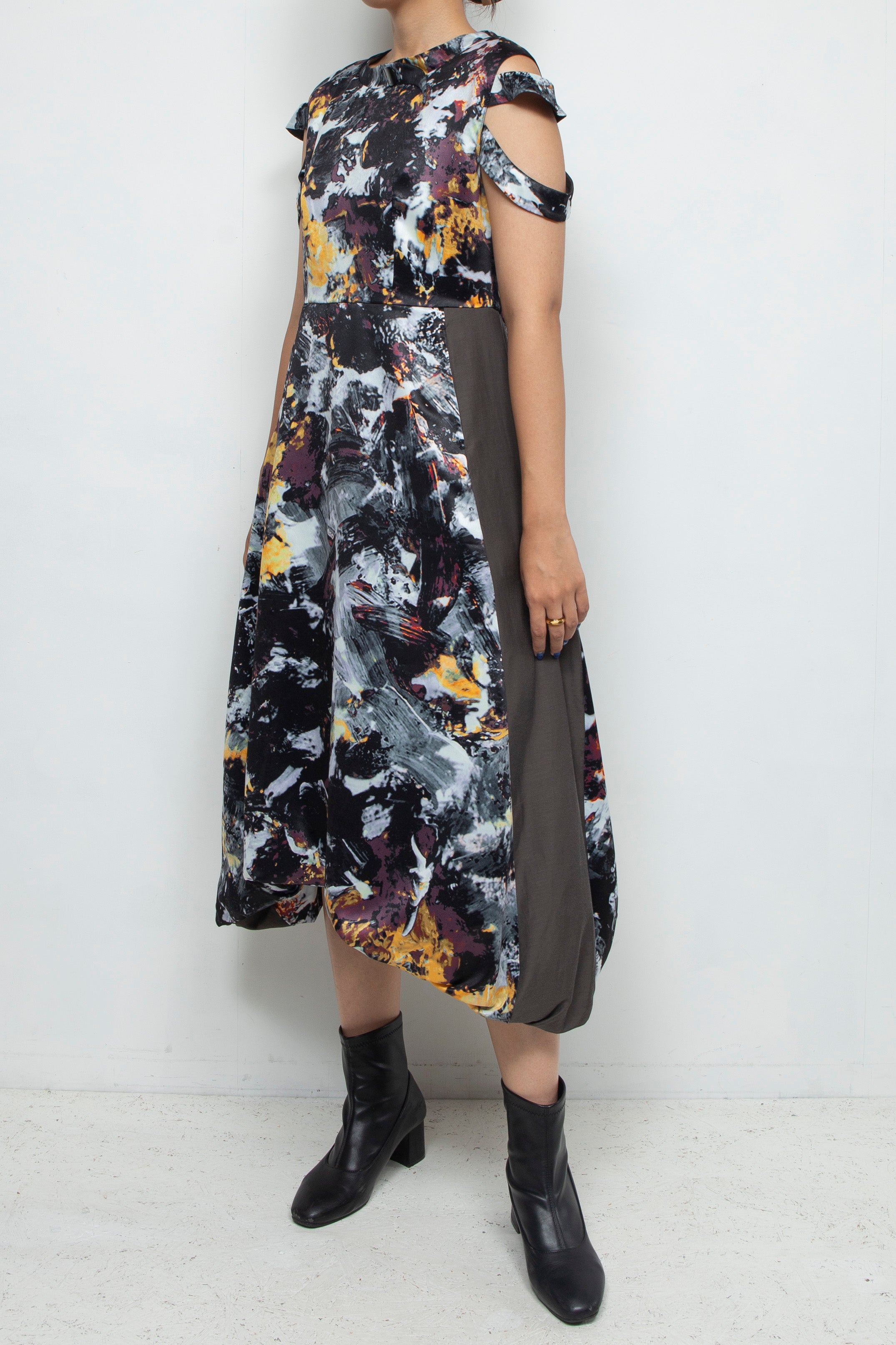 イエローの生地に浮かぶのは、連なりのある幻想的なドローイング。クラシックな形とユニークな柄のバランスが特徴的なワンピースです。