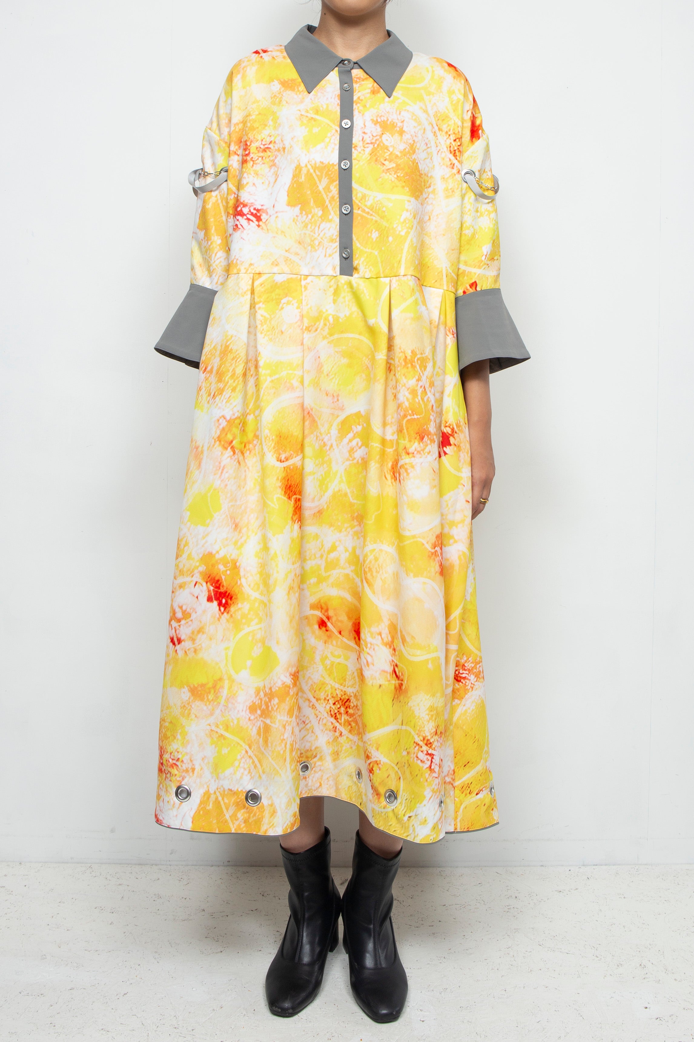 グリーン、アイボリー、ゴールドの配色が美しいロングワンピース。