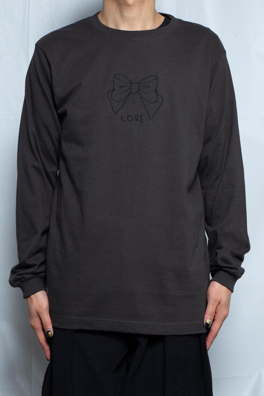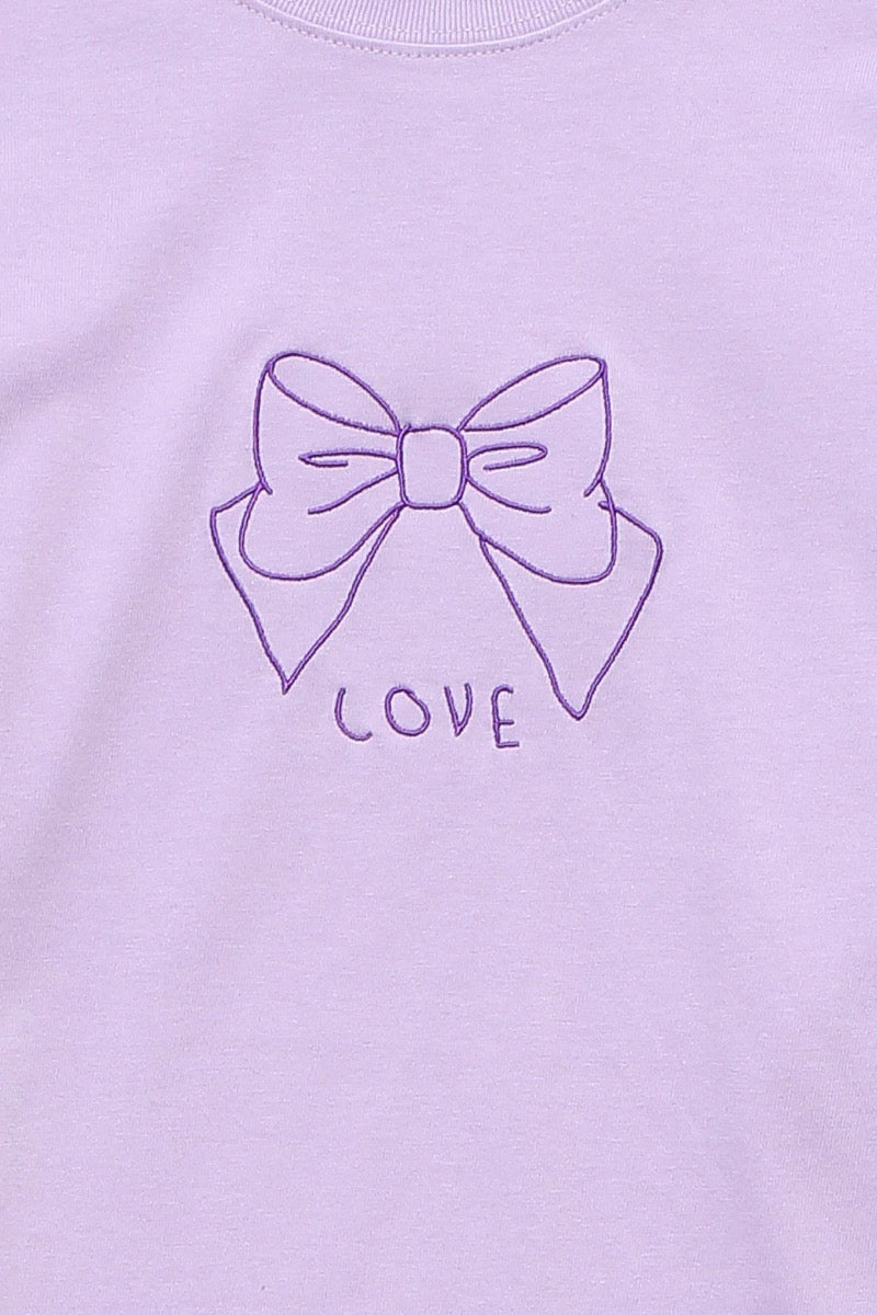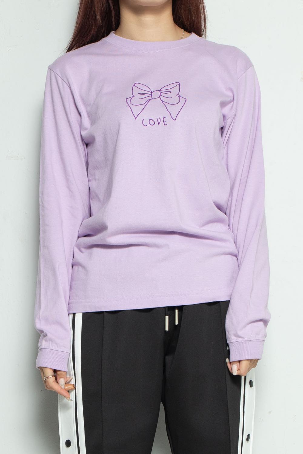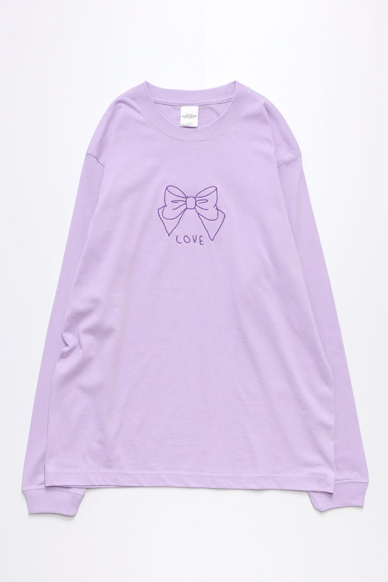 胸元には落書きのようなリボンのグラフィックが刺繍されています。