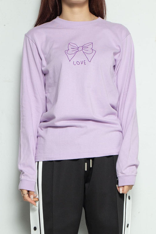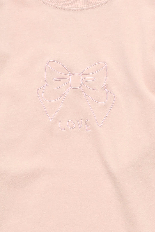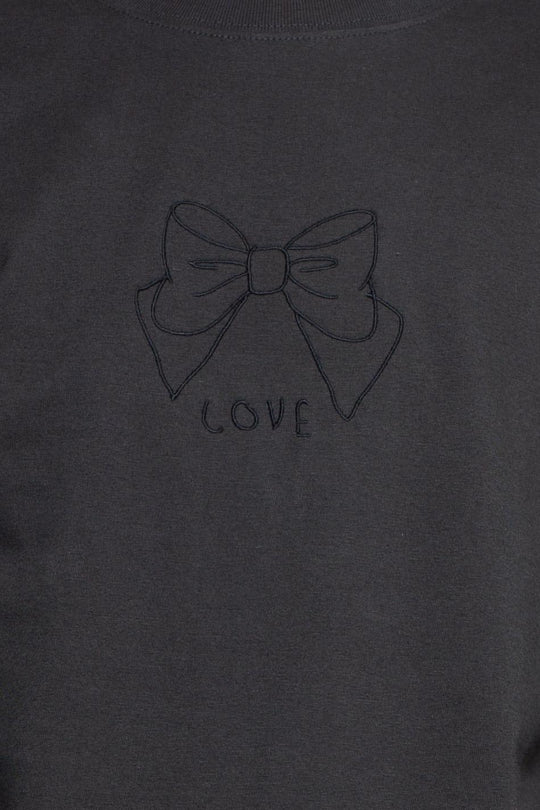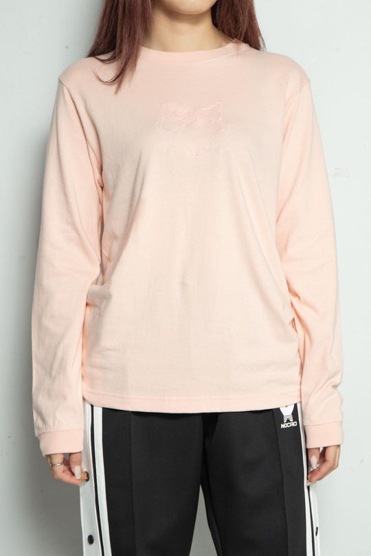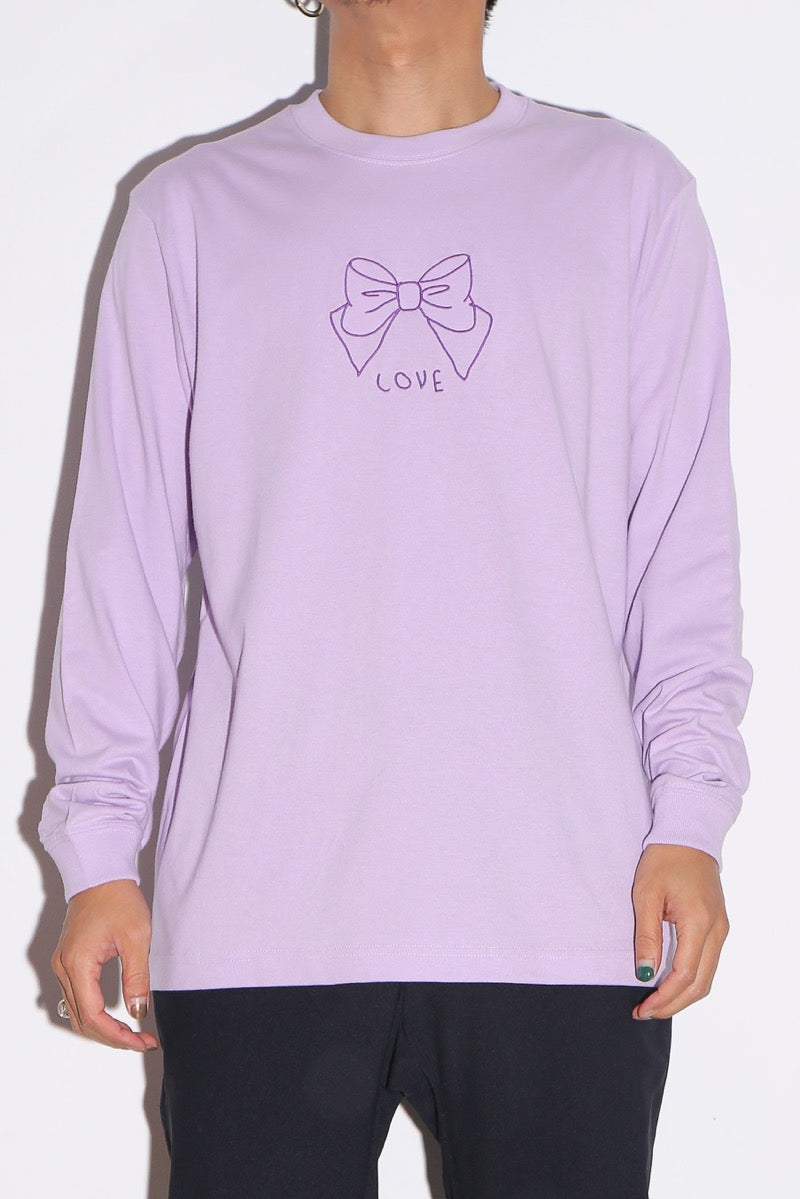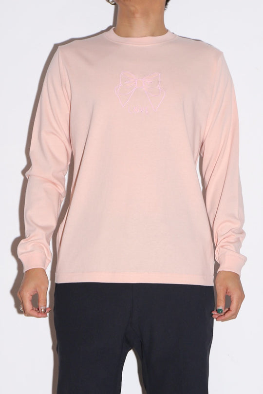胸元には落書きのようなリボンのグラフィックが刺繍されています。