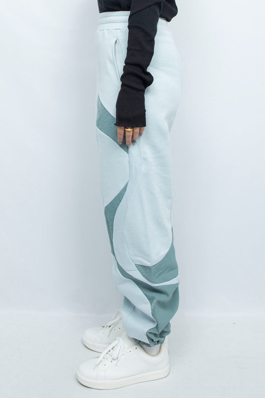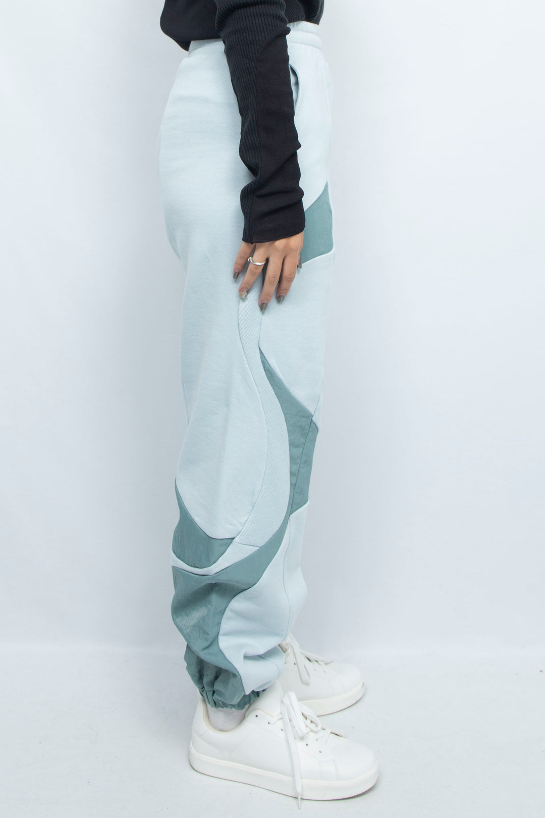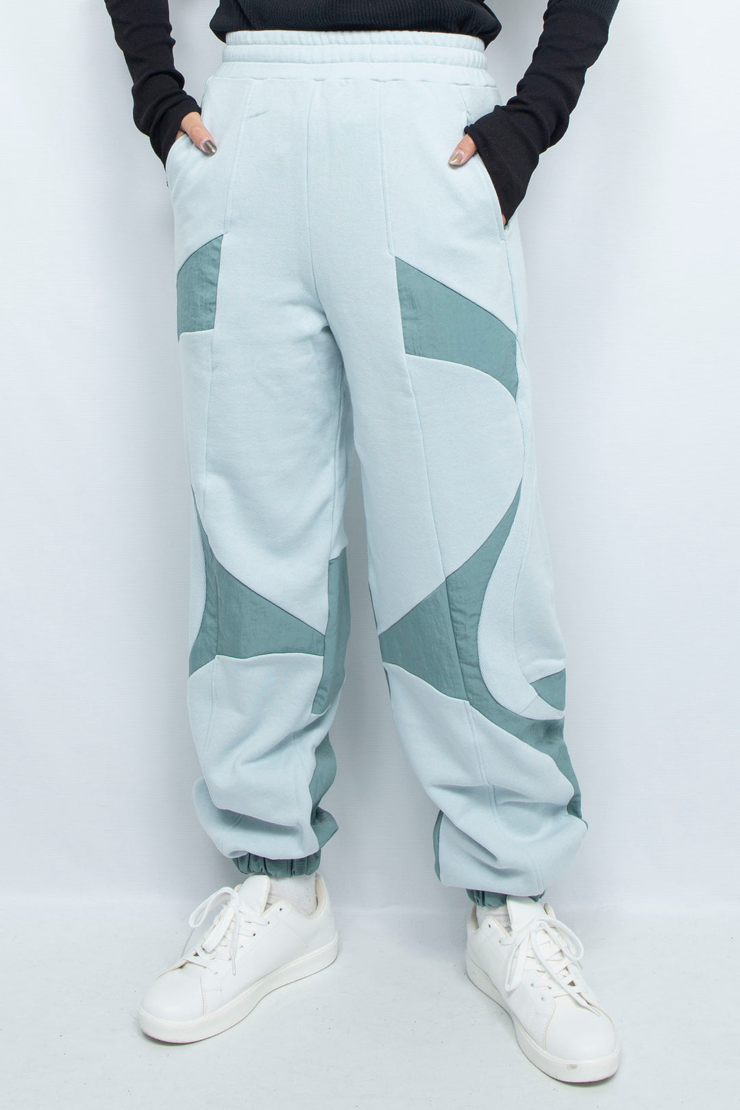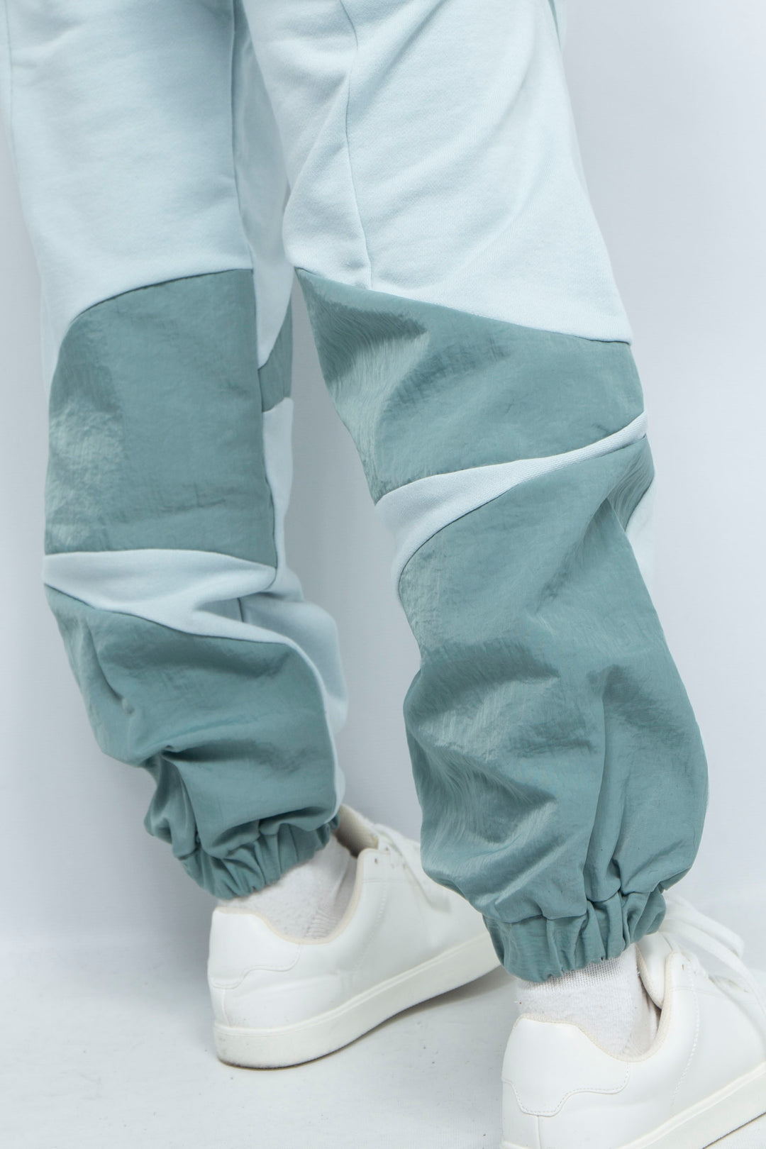 ナイロンとリブとの切り替えデザインのスウェットパンツ。