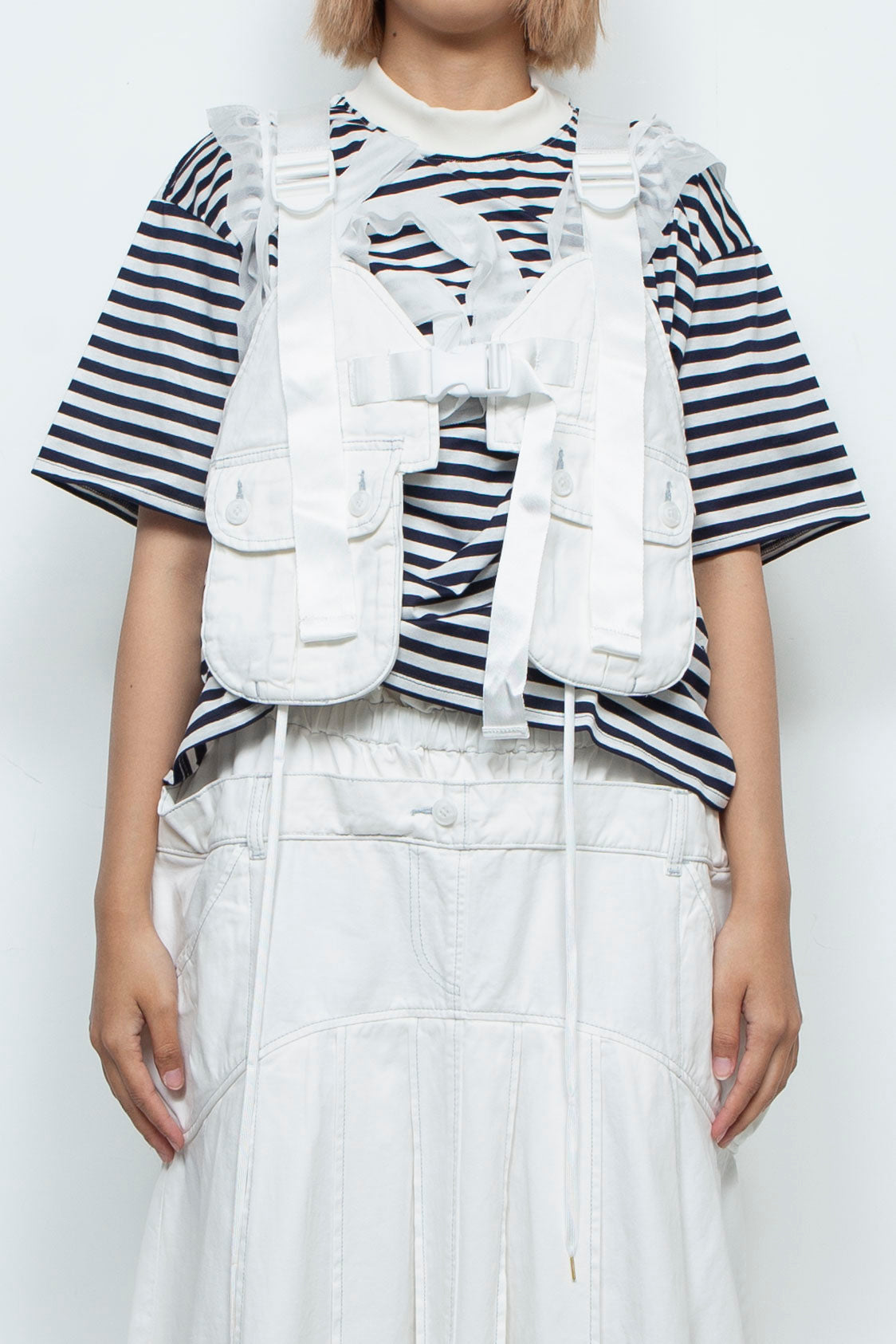 サイドのボタンや肩紐でサイズ調節可能。
