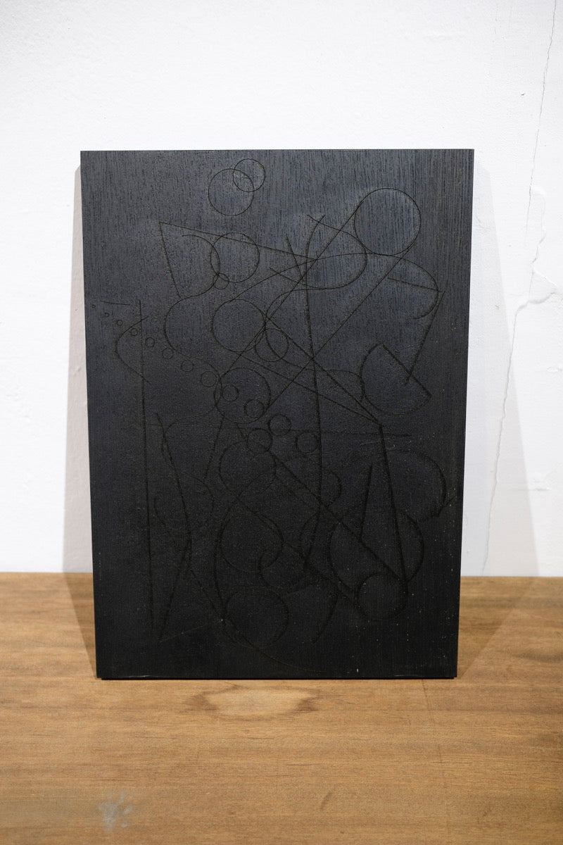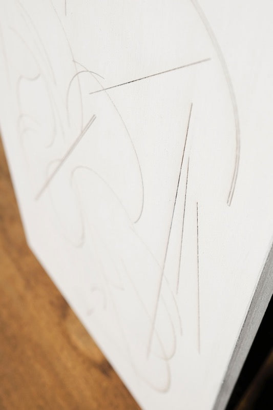 ペイントしたキャンバスにレーザーカッターを当てることで、素材感のある柄を描いています。