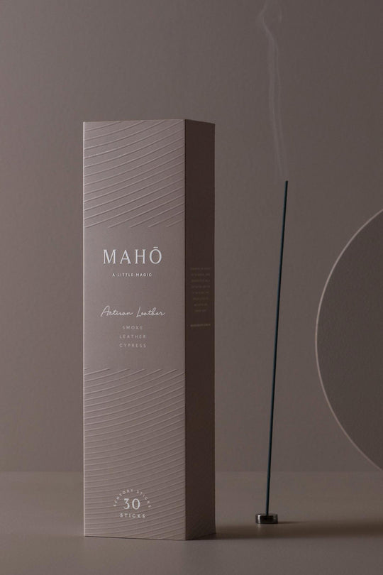 お香の先端に火をつけます。口で吹くか手で扇いで火を消してください。お香からは輝く残火が発され、そこから煙と共に香りが漂い出します。燻るお香を MAHŌのお香立てに立てかけて、あとはたっぷりとリラックスしてください。
