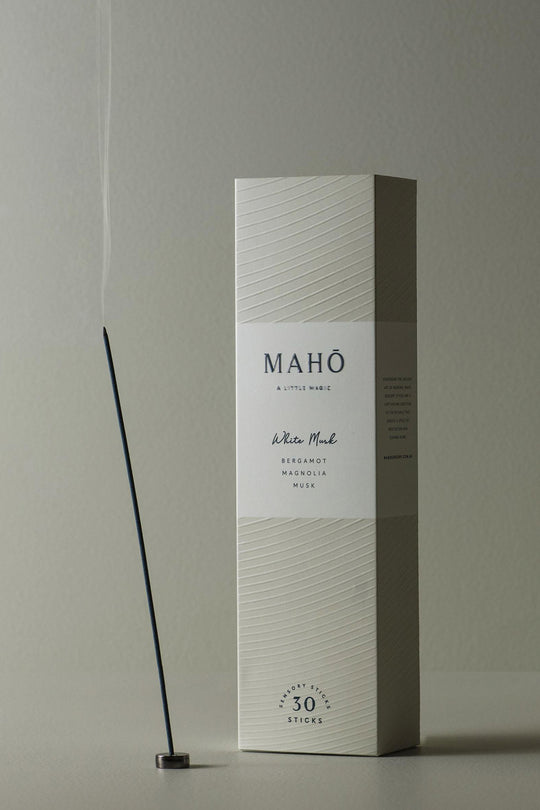 お香の先端に火をつけます。口で吹くか手で扇いで火を消してください。お香からは輝く残火が発され、そこから煙と共に香りが漂い出します。燻るお香を MAHŌのお香立てに立てかけて、あとはたっぷりとリラックスしてください。