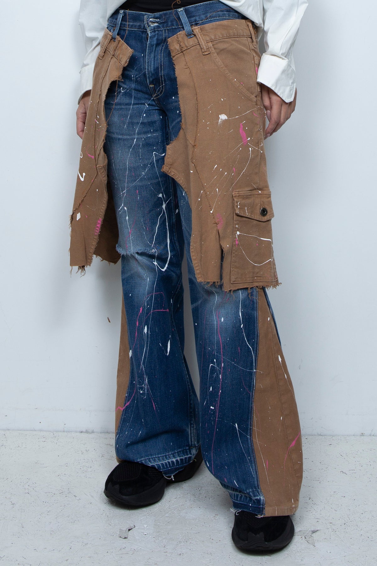 デニムのパンツを土台で使用し、ブラウンのカーゴパンツをラップスカート風にレイヤードされたデザイン。