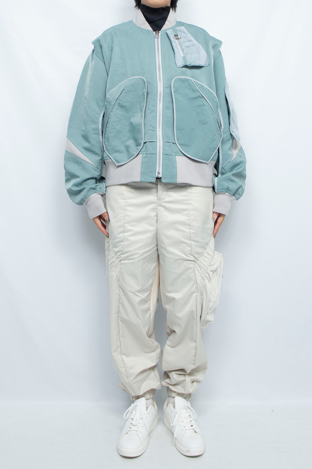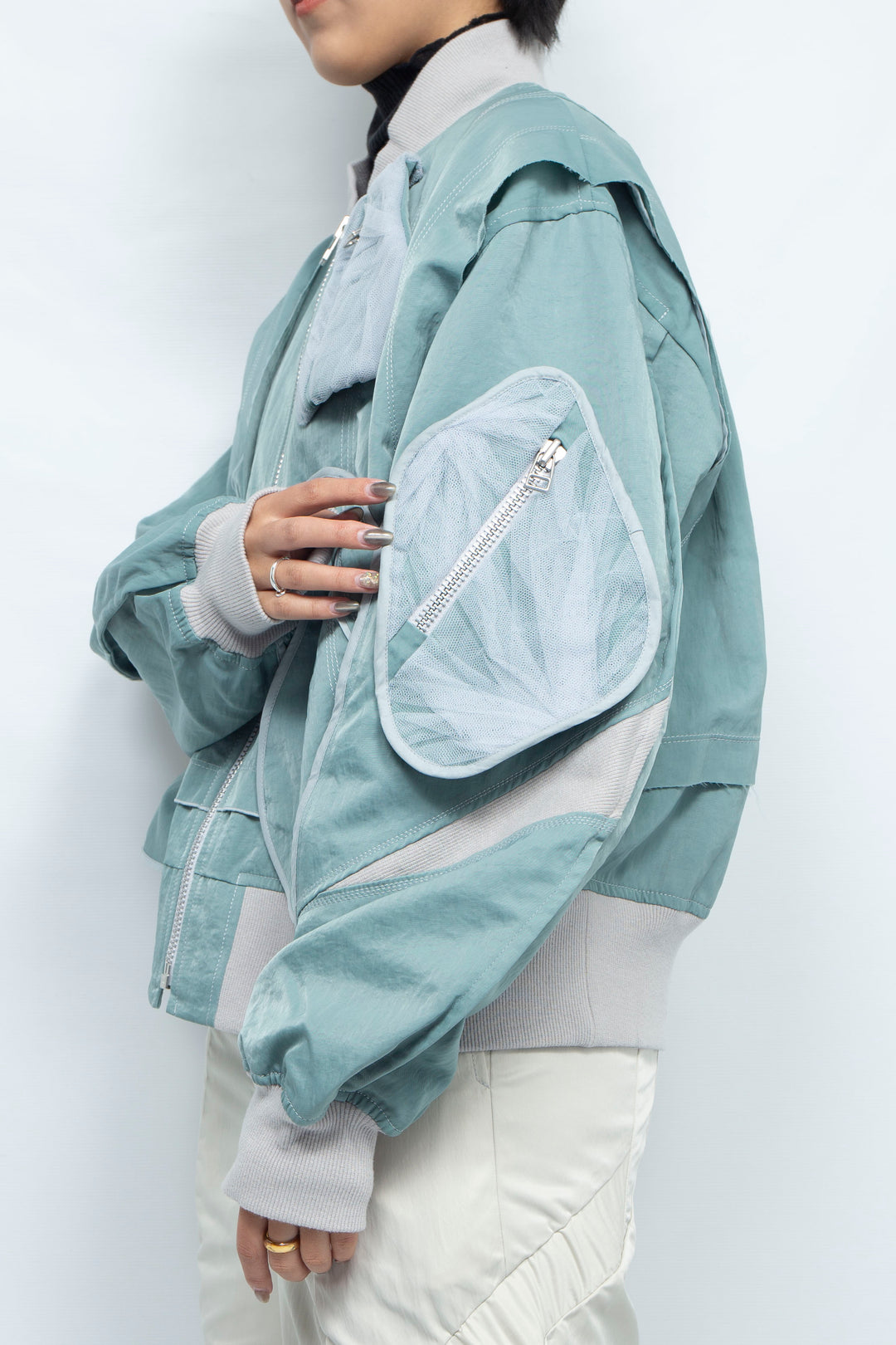 随所にチュールがレイヤードされた薄手のナイロン生地によるMA-1タイプのデザインアウター。
