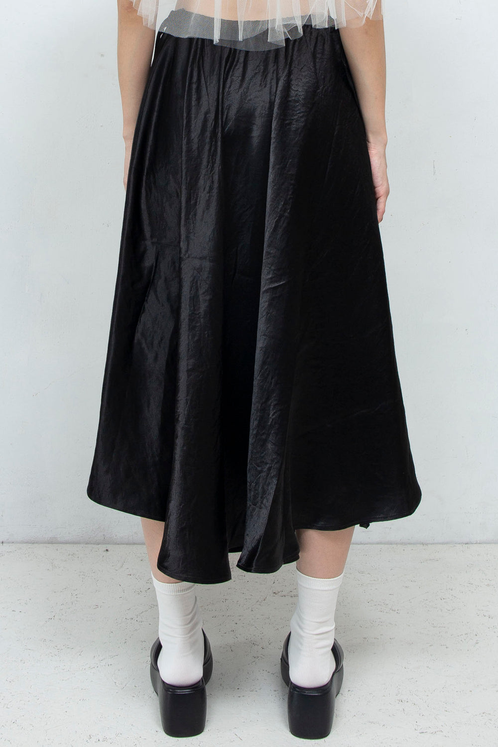 ミニマルなデザインのフレアスカート。光沢のある生地感とシンメトリーなドレープが品のある雰囲気に。