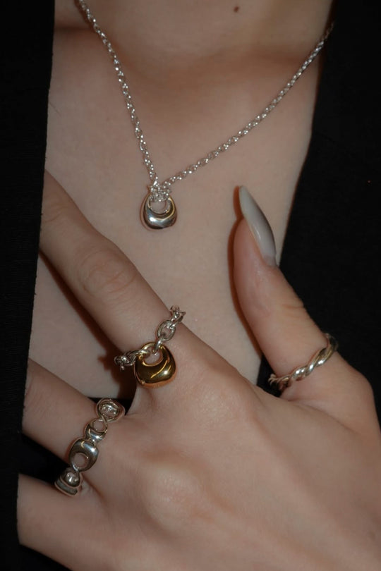 程よい存在感のあるシルバーチェーンに、中心にはひと粒のゴールドパーツが添えられた構造。