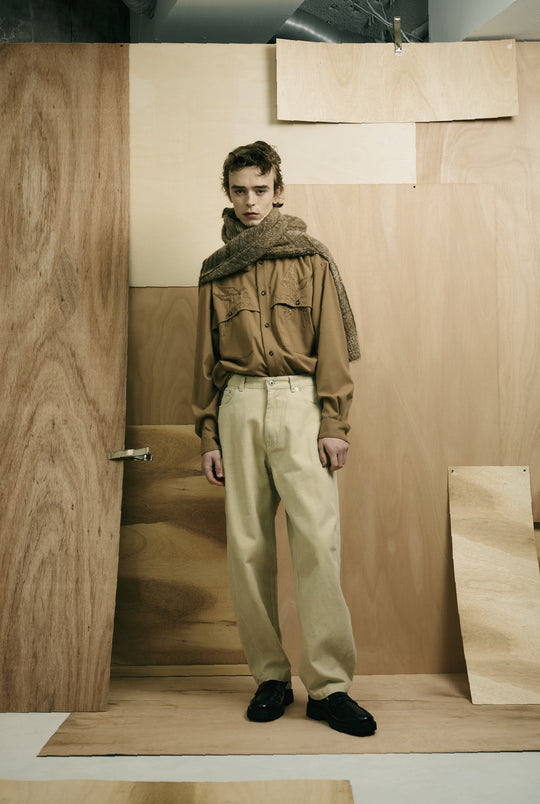 This cotton twill is both bold and refined, offering an elegant yet sturdy feel. Available in two colors: ecru white and a sophisticated charcoal brown, staying true to the signature style of arenotis. The barrel chinos feature curved side seams and darts, created through a three-dimensional cut, which results in a sculpted silhouette. A product wash is applied to maintain arenotis's signature elegance while achieving a faded color tone that reflects the season's mood. The white graphic paint accents on these chinos provide a unique touch, adding to their bold yet refined aesthetic.
