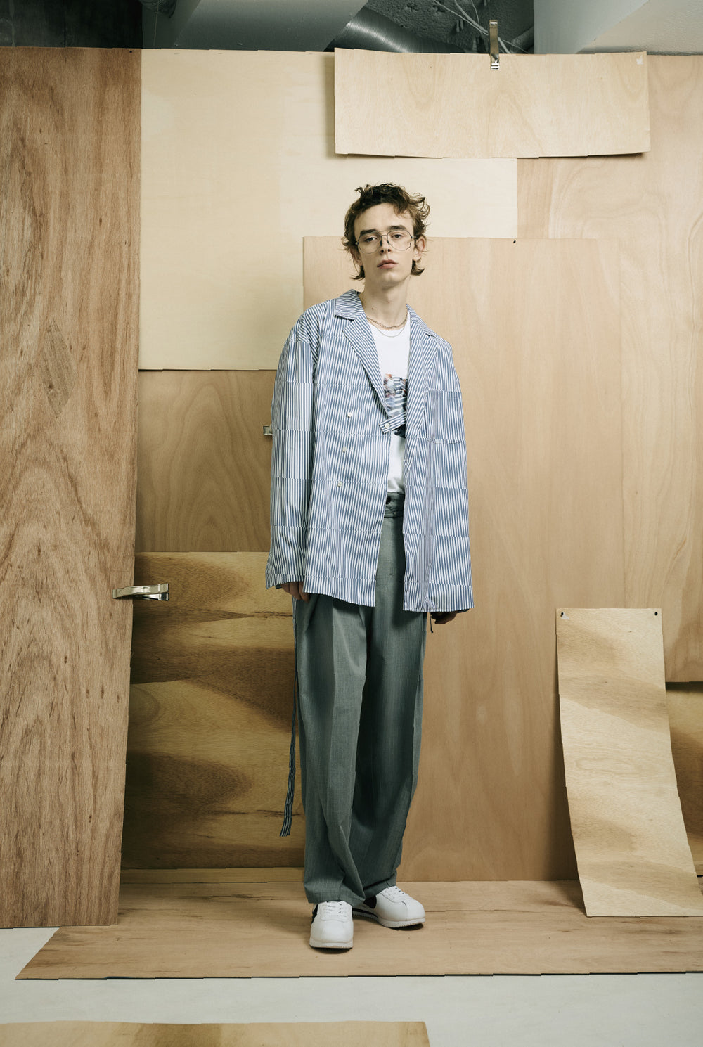 股上を深めにとることでウエスト位置をお好みの位置でご着用いただけルーズな印象にも、ハイウエストでロールアップしてソックスを見せていただくのもおすすめです。クラシックな印象のピンタックトラウザーズににナローベルテッドがアクセントとなっております。
