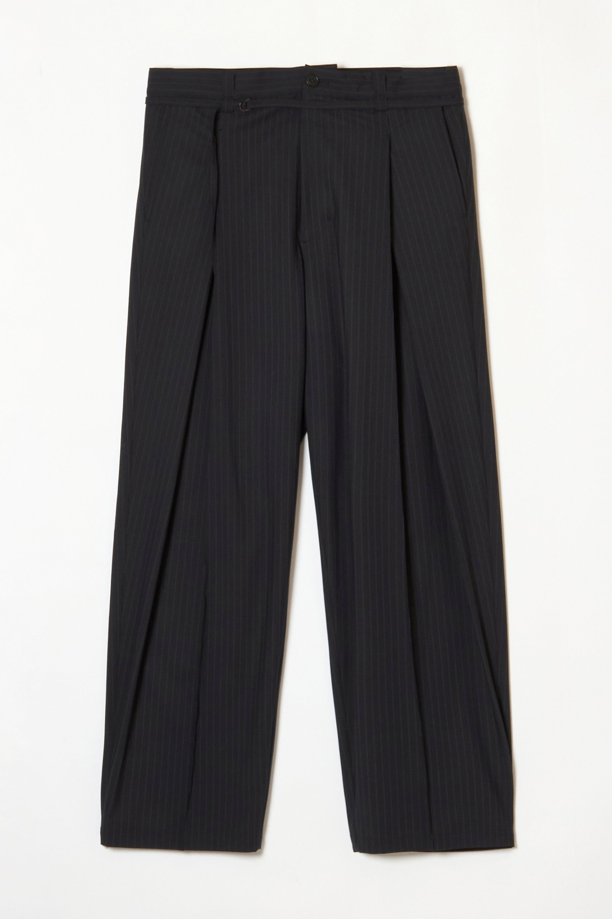 This pair of trousers is made from a stretch polyester-rayon blend using siro compact yarn—a high-quality material known for its durability. The fabric is resistant to wrinkles and pilling, offering a lightweight, smooth feel that is perfect for year-round wear. The fabric has a refined, subtle finish with a delicate yet clear surface, making it an elegant pinstripe pattern that is understated yet sophisticated, in true arenotis style. The trousers feature deep, layered tucks at the front and have a tapered silhouette that narrows toward the hem. As you move, the tucks open up, creating a balloon-like effect. When the tucks are closed, the silhouette falls like a classic pair of slacks. The slightly higher rise allows for flexible wear—looser when worn at the waist or styled with a high waist and rolled-up cuffs to reveal socks. A narrow belted waist adds an extra touch of elegance to this classic pinstriped trouser.